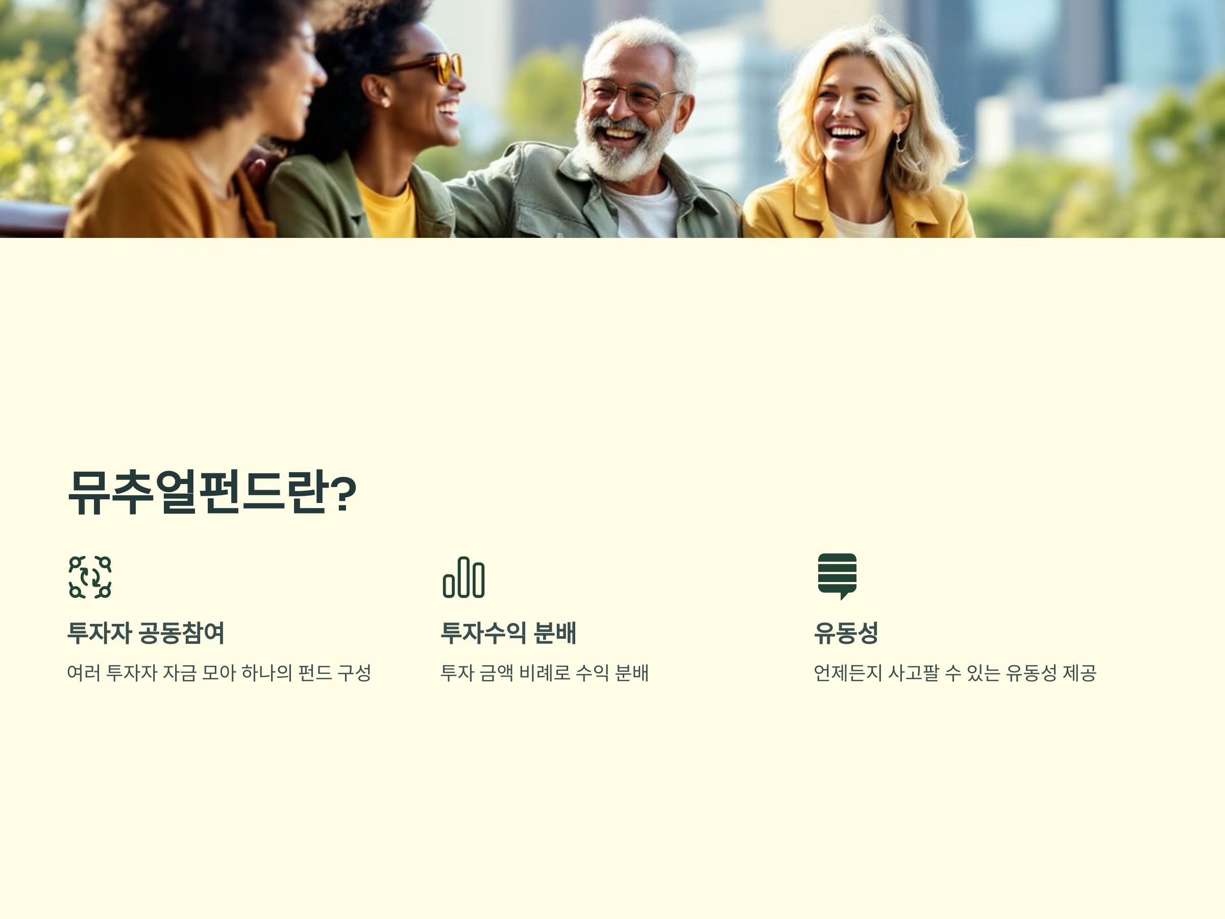 - 뮤추얼펀드: 뮤추얼펀드는 여러 투자자들의 자금을 모아 관리 전문가가 자산을 운용하는 방식입니다.