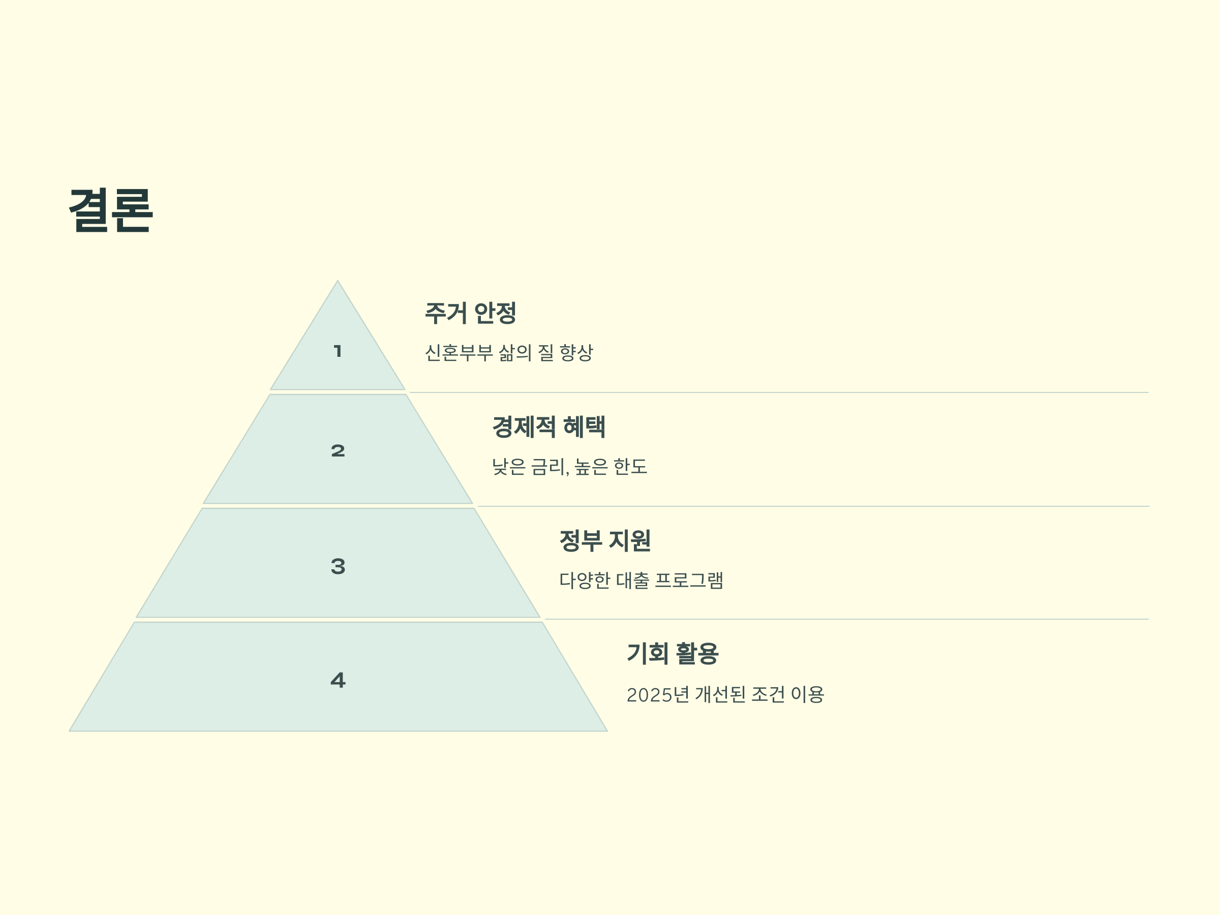 2025년의 신혼부부 대출 우대 조건은 금리와 한도 면에서 큰 혜택을 제공하고 있습니다. 이를 최대한 활용하기 위해서는 자격 요건을 잘 파악하고, 대출 신청 전에 신용 점수나 대출 상환 계획을 철저히 점검하는 것이 중요합니다. 정부의 다양한 대출 지원 프로그램을 적극적으로 이용하면, 신혼부부들이 보다 적은 부담으로 주택을 마련할 수 있을 것입니다.