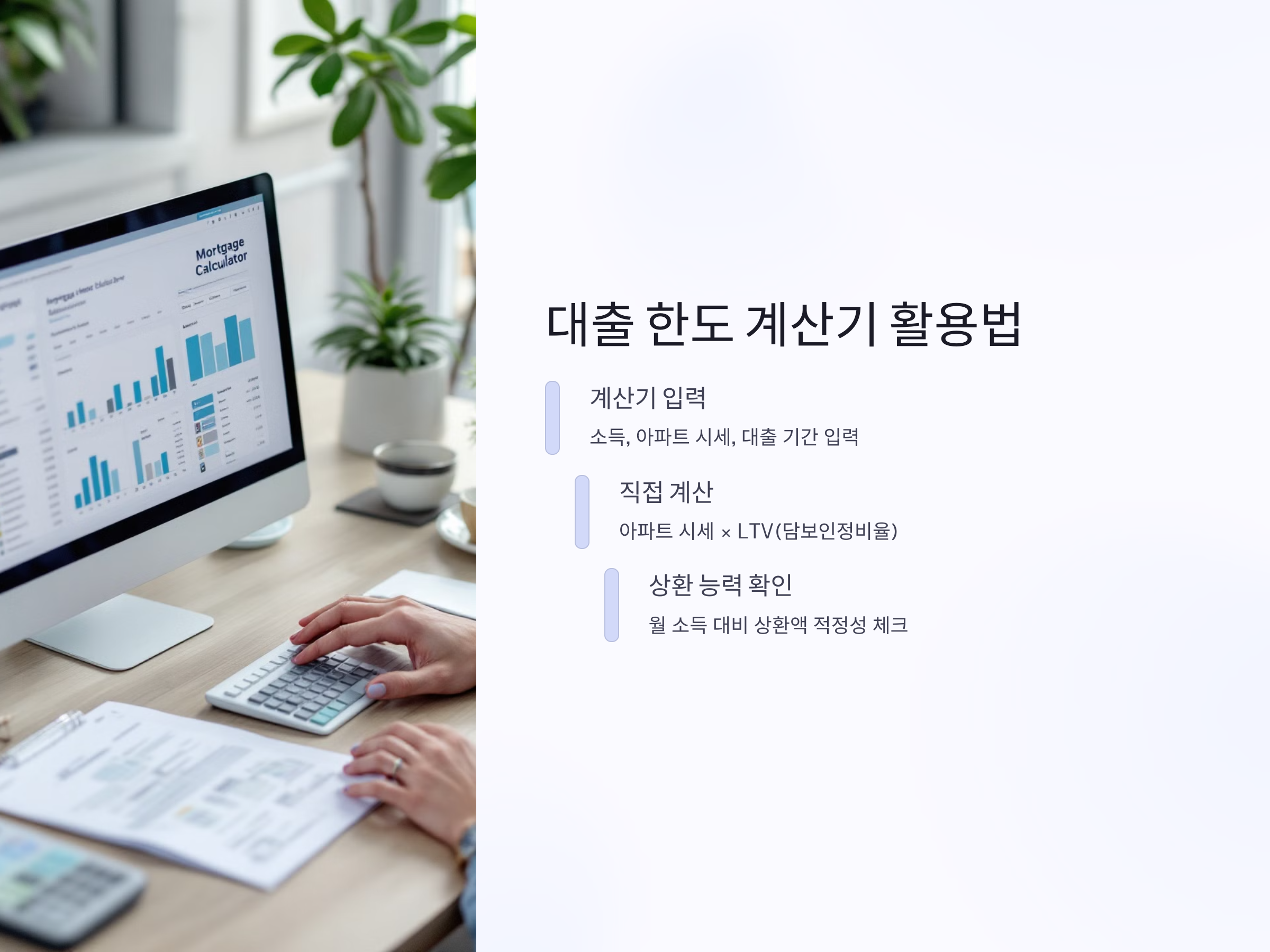 아파트 담보 대출 한도를 정확히 계산하려면, 아파트 시세, 상환 능력, 금리 등을 종합적으로 고려해야 합니다. 또한, 대출을 받기 전, 자신의 상환 능력을 과소평가하지 않도록 주의하고, 다양한 금융기관의 조건을 비교하는 것이 중요합니다. 계산기를 활용하거나 전문가의 도움을 받아 정확한 대출 한도를 파악하고, 계획적으로 대출을 받는 것이 필요합니다.