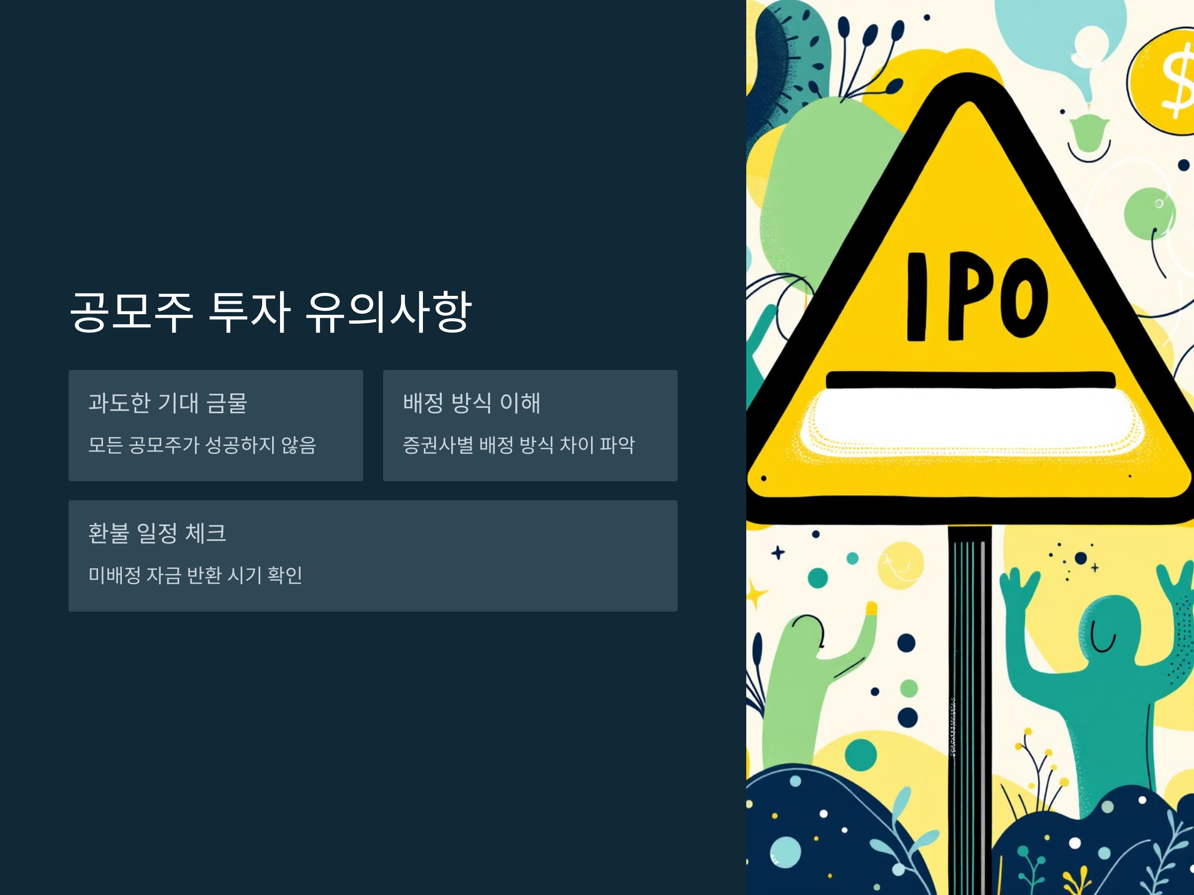 공모주 투자는 수익 가능성이 높은 만큼, 몇 가지 유의해야 할 사항이 있습니다.
