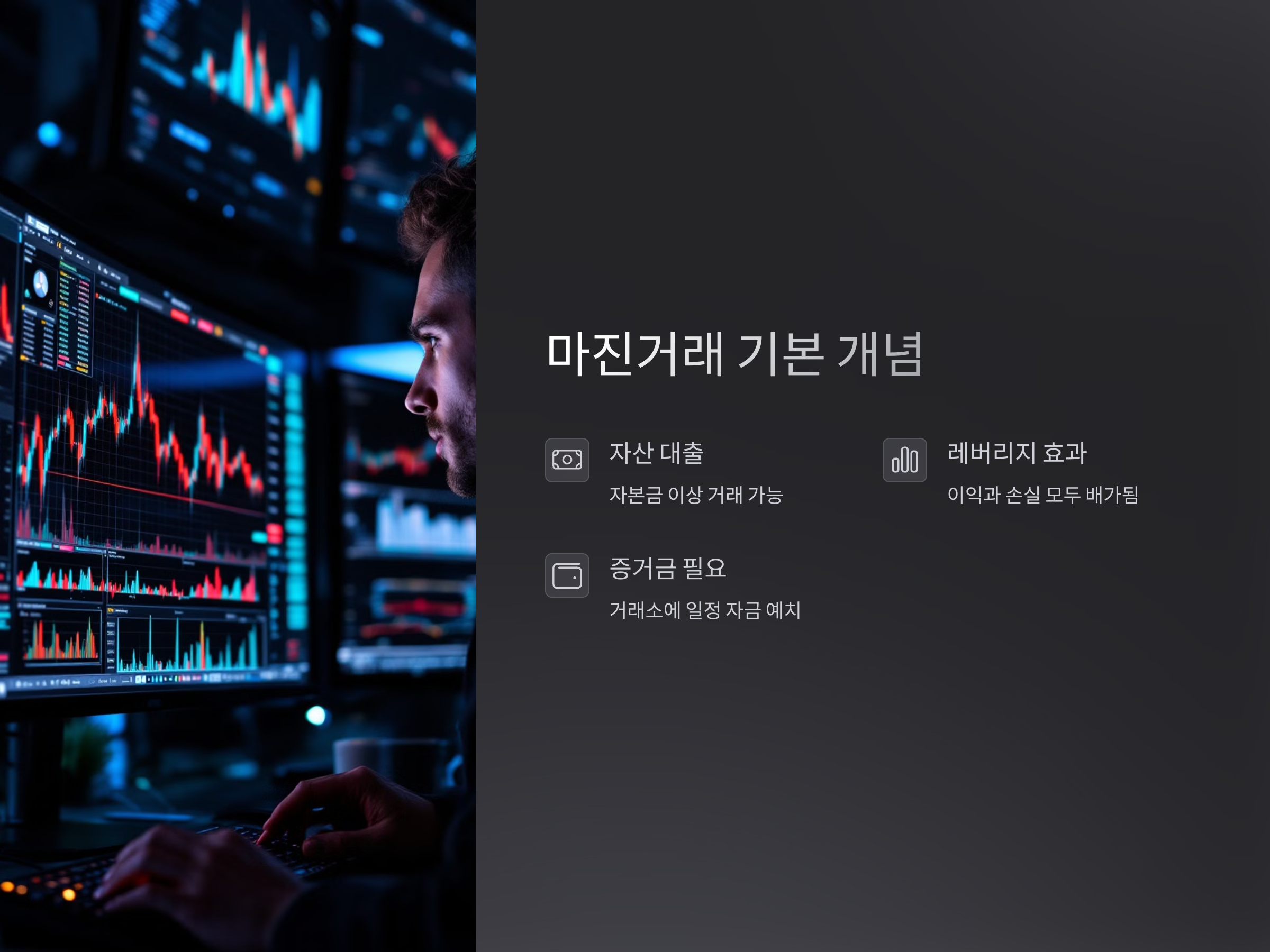 마진거래란 자산을 빌려서 거래를 진행하는 방식입니다. 투자자는 본인의 자본금 이상으로 자산을 거래할 수 있으며, 이를 통해 이익을 극대화할 수 있습니다. 예를 들어, 2배의 레버리지를 사용하면 본인의 자본금 1배로 2배의 규모로 거래를 할 수 있게 됩니다. 하지만 이와 같은 레버리지 사용은 이익을 늘려주는 동시에 손실도 두 배로 만들 수 있다는 점에서 위험 요소가 존재합니다.