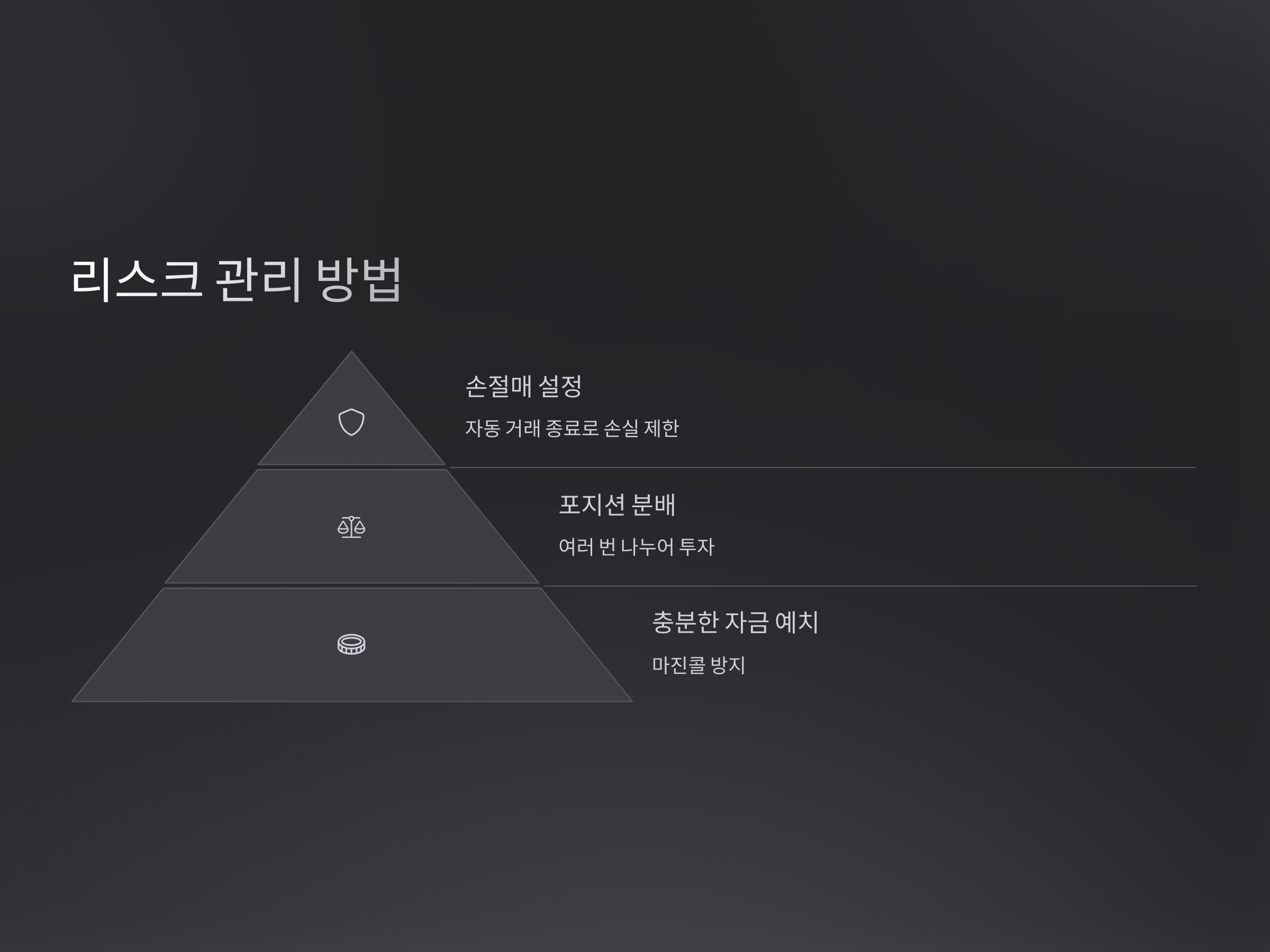 리스크 관리를 위한 첫 번째 방법은 포지션을 적절히 분배하는 것입니다. 모든 자금을 한 번에 마진거래에 투자하는 것보다는 여러 번에 나누어 투자하는 것이 리스크를 분산시키는 데 도움이 됩니다. 또한, 손절매(stop-loss) 전략을 세워서 일정 손실이 발생하면 자동으로 거래를 종료하도록 설정하는 것이 중요합니다. 이를 통해 급격한 손실을 방지하고, 자산을 보호할 수 있습니다.