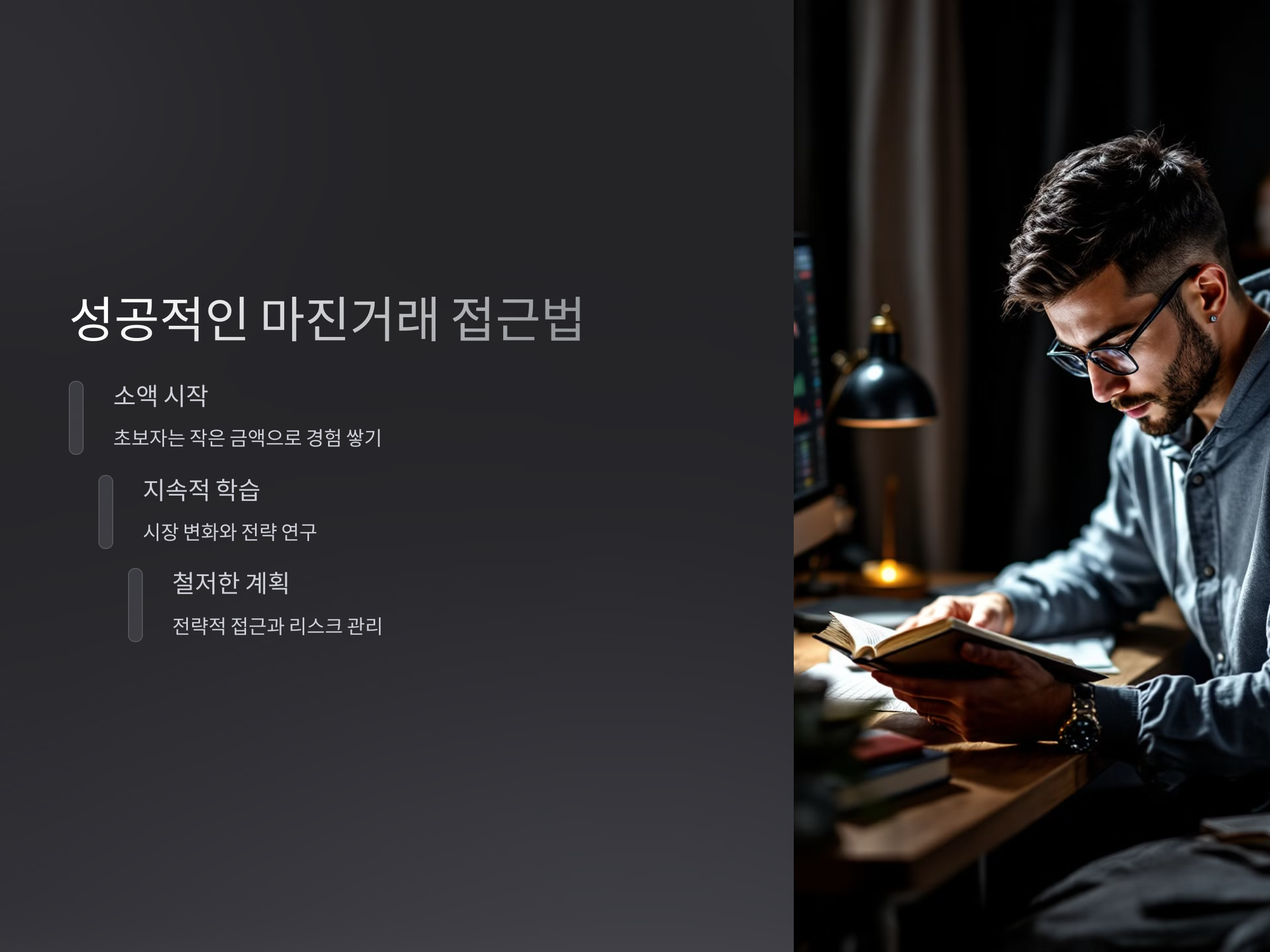 마진거래에서 가장 중요한 것은 자신에게 맞는 전략을 찾는 것입니다. 시장의 트렌드를 파악하고, 기술적 분석을 활용하는 것이 효과적인 방법입니다. 또한, 항상 리스크를 분산시키고, 손절매 전략을 사용해야 합니다.