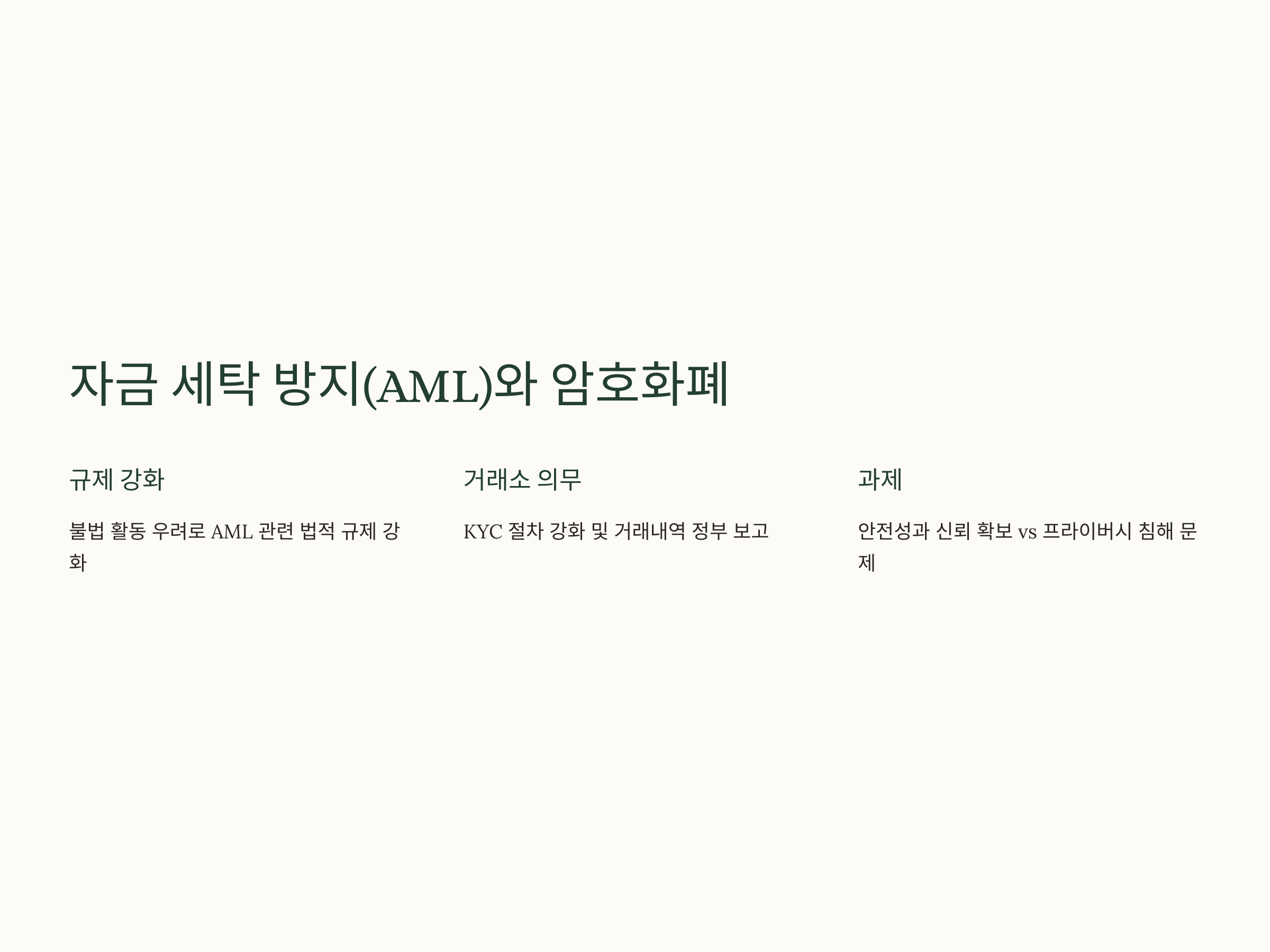 암호화폐가 자금 세탁이나 불법적인 활동에 악용될 수 있다는 우려가 커지면서, 많은 국가들은 자금 세탁 방지(AML)와 관련된 법적 규제를 강화하고 있습니다. 암호화폐 거래소들은 고객의 신원 확인(KYC, Know Your Customer) 절차를 강화하고, 거래내역을 정부에 보고하는 등의 의무를 지고 있습니다. 이러한 규제는 암호화폐를 안전하고 신뢰할 수 있는 자산으로 자리잡게 할 수 있지만, 동시에 사용자들에게는 프라이버시 침해 등의 문제를 일으킬 수도 있습니다.
