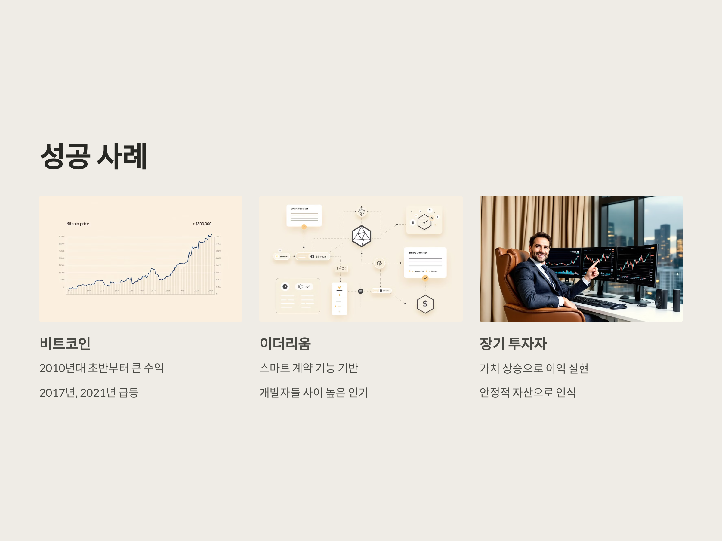 암호화폐 장기투자에서 성공한 사례들이 많습니다. 가장 대표적인 예는 비트코인입니다. 비트코인은 2010년대 초반부터 투자자들에게 큰 수익을 안겨주었으며, 특히 2017년과 2021년의 급등은 많은 사람들에게 장기투자의 유망성을 입증했습니다. 비트코인을 초기에 구매한 투자자들은 그 가치를 여러 배로 상승시키며 큰 이익을 얻을 수 있었습니다.