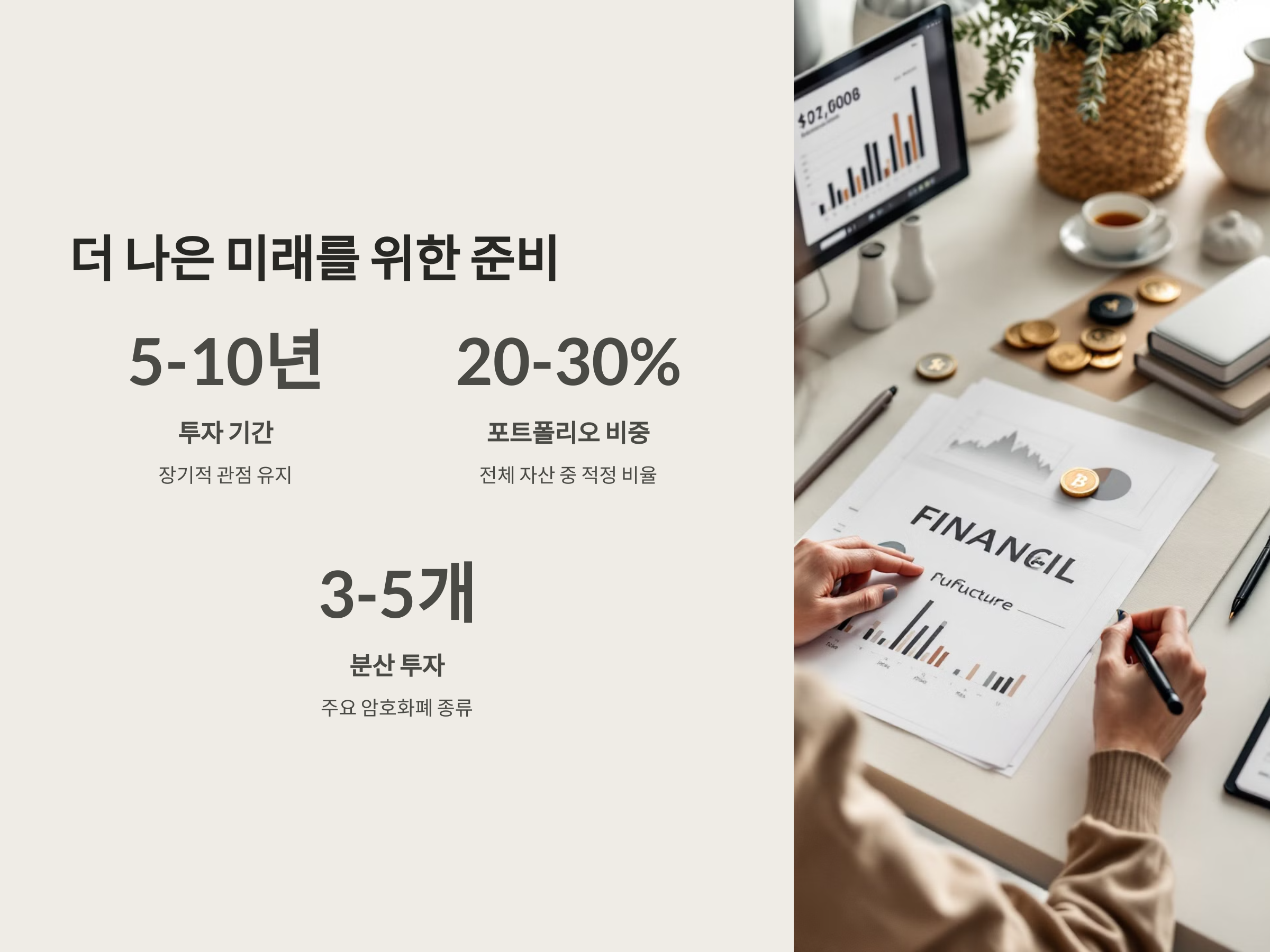 마지막으로, 리스크 관리와 포트폴리오 다각화가 핵심입니다. 암호화폐의 가격 변동성을 감안하여, 여러 종목에 분산 투자하는 것이 좋습니다. 예를 들어, 비트코인과 이더리움 외에도 일부 신생 프로젝트에 소액을 투자하는 방식으로 포트폴리오를 구성할 수 있습니다.