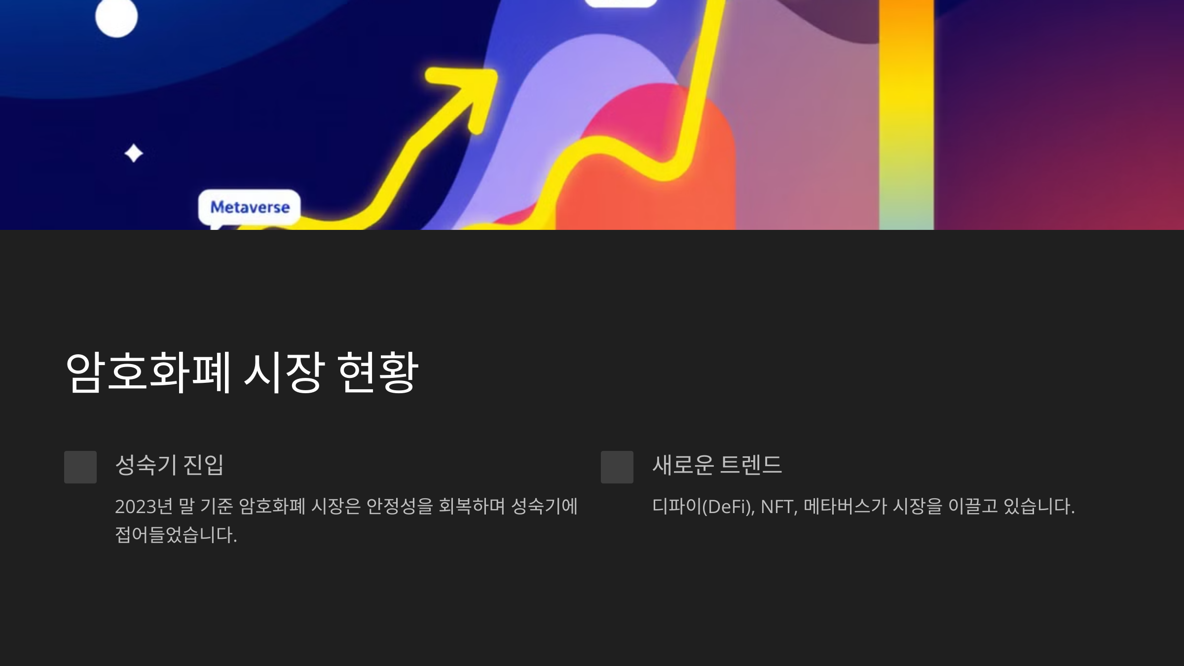 암호화폐 시장은 2023년 말 기준으로 안정성을 일부 회복하며 성숙기에 접어들었습니다. 비트코인(BTC), 이더리움(ETH)과 같은 주요 암호화폐는 여전히 시장의 중심에 있지만, 디파이(DeFi), NFT, 메타버스와 같은 새로운 트렌드가 시장을 이끌고 있습니다.
