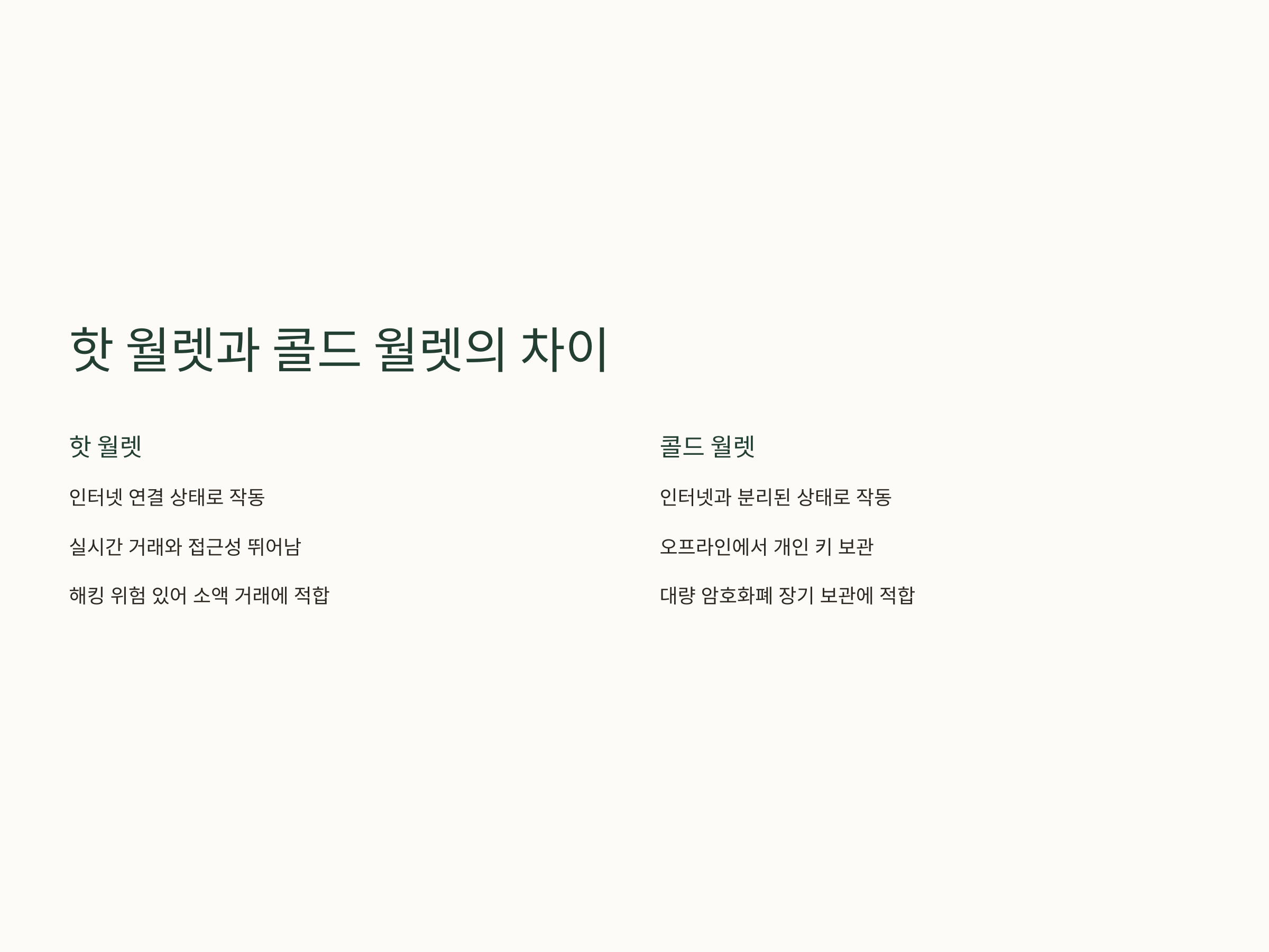 콜드 월렛(Cold Wallet): 인터넷과 분리된 상태에서 작동하는 지갑으로, 오프라인에서 개인 키를 보관하여 보안성이 높습니다. 하드웨어 지갑, 종이 지갑 등이 이에 속합니다. 해킹 위험이 적어 대량의 암호화폐를 장기간 보관하는 데 적합하지만, 거래 시에는 다소 불편함이 있을 수 있습니다.