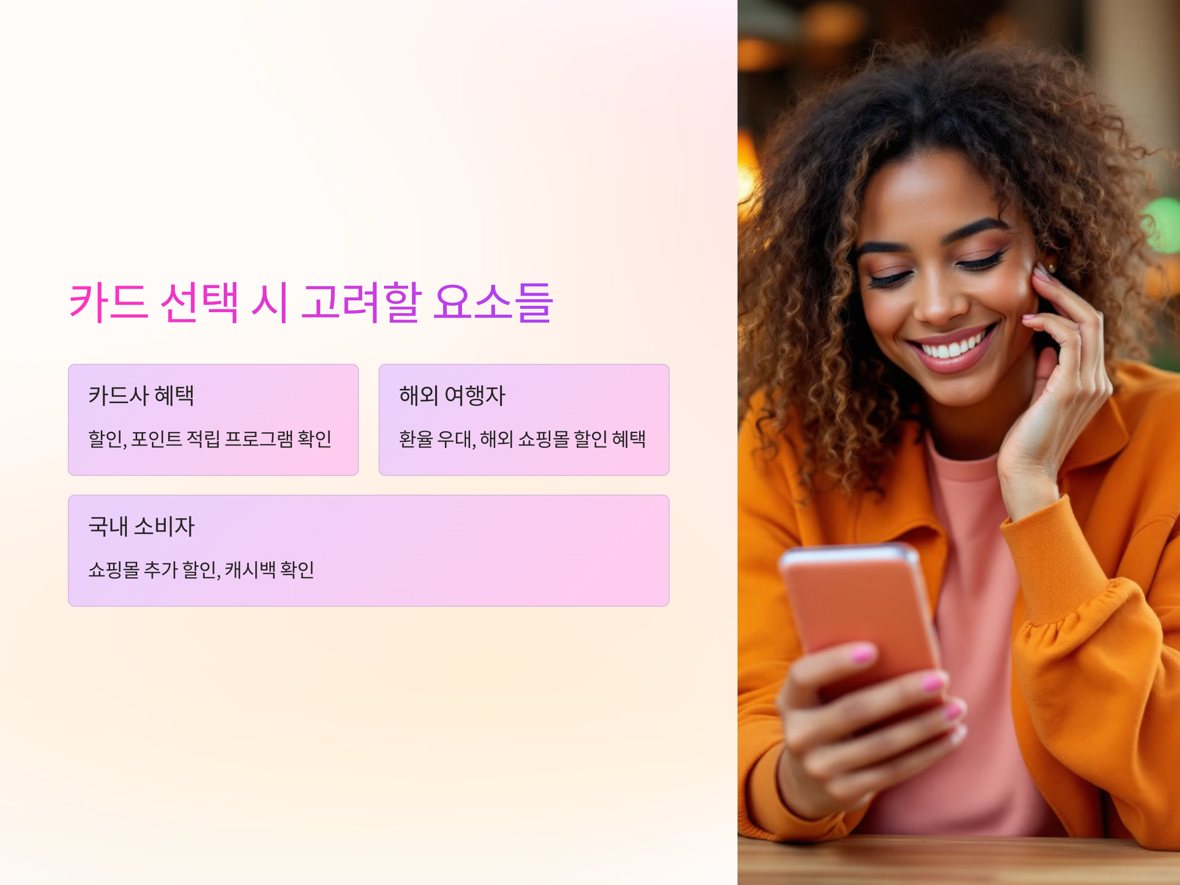 국내 결제 시에는 할인 혜택이나 캐시백 등을 제공하는 카드도 많기 때문에, 소비 패턴에 맞게 혜택을 최대화할 수 있는 카드를 선택하는 것이 중요합니다. 예를 들어, 쇼핑을 자주 한다면 특정 온라인 쇼핑몰에서 추가 할인을 제공하는 카드를 고려할 수 있습니다.