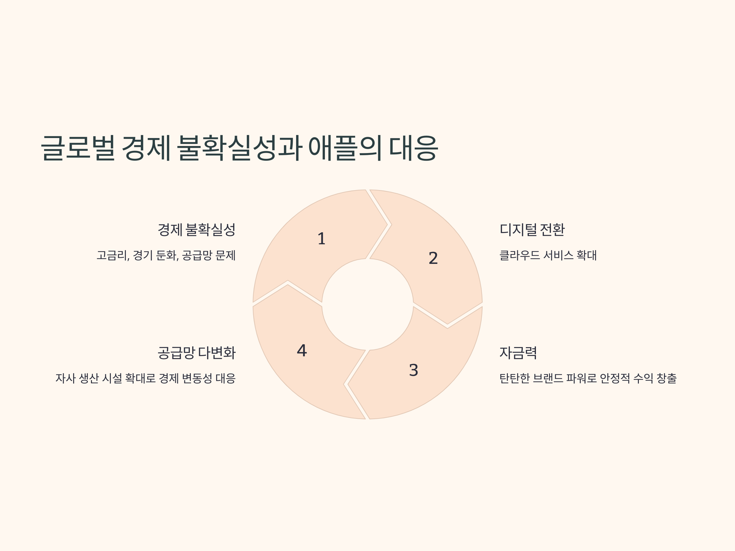 글로벌 경제는 불확실성으로 가득 차 있습니다. 특히, 고금리 정책, 경기 둔화, 공급망 문제 등은 애플과 같은 글로벌 대기업에도 큰 영향을 미칠 수 있습니다. 애플은 최근 몇 년간 "디지털 전환"과 "클라우드 서비스"를 확대하며 대응하고 있지만, 외부 경제 요인의 변화는 여전히 중요한 변수로 남아 있습니다.