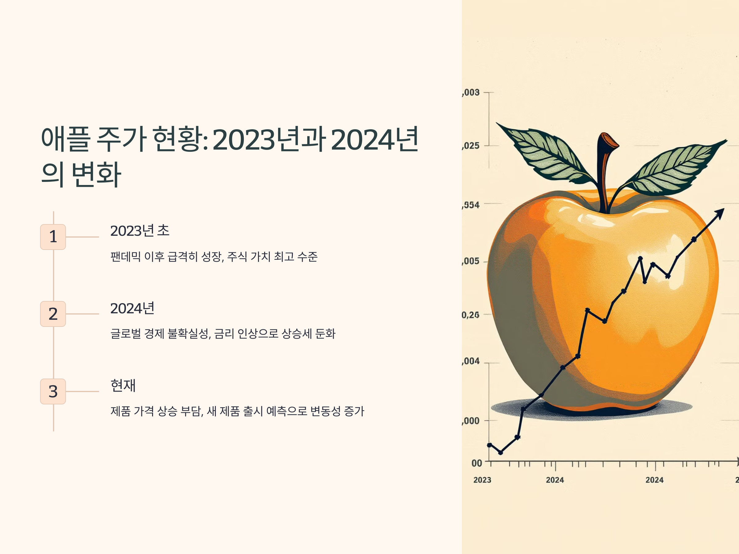 2023년과 2024년 애플의 주가는 매우 흥미로운 변곡점을 보여주었습니다. 2023년 초, 애플은 팬데믹 이후 급격히 성장한 기술주들의 흐름을 이어가며 주식 가치를 최고 수준까지 끌어올렸습니다. 그러나 2024년에는 글로벌 경제 불확실성, 금리 인상, 그리고 원자재 가격 상승 등으로 인해 그 상승세가 다소 둔화되었습니다.