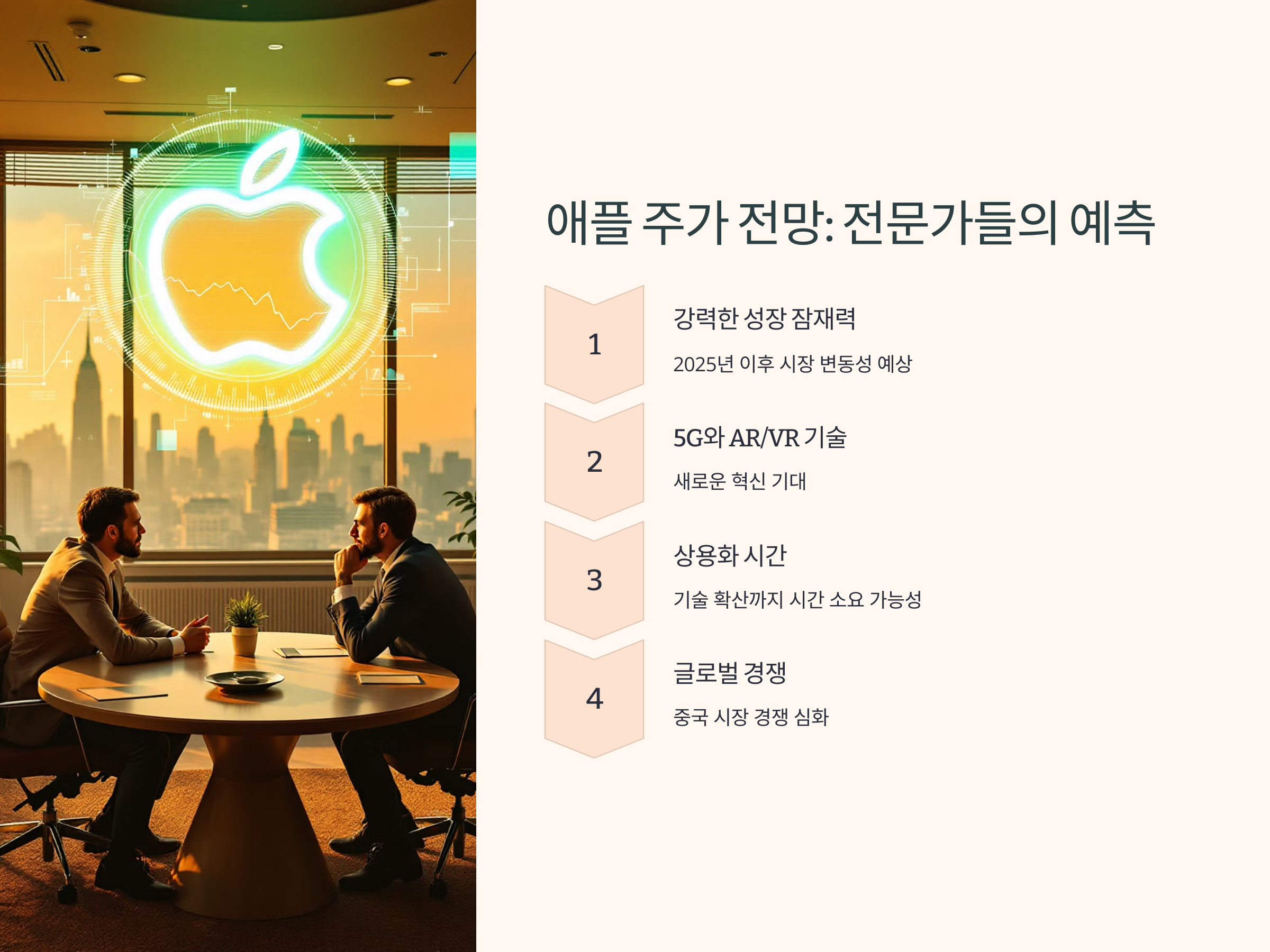 애플의 주가는 앞으로도 계속해서 강력한 성장 잠재력을 가지고 있지만, 일부 전문가들은 2025년 이후 시장에 큰 변동성이 있을 것이라고 예측하고 있습니다. 2023년과 2024년의 성과에 비해 다소 보수적인 전망이 나온 이유는, 기술 산업의 경쟁이 심화되고 있기 때문입니다.