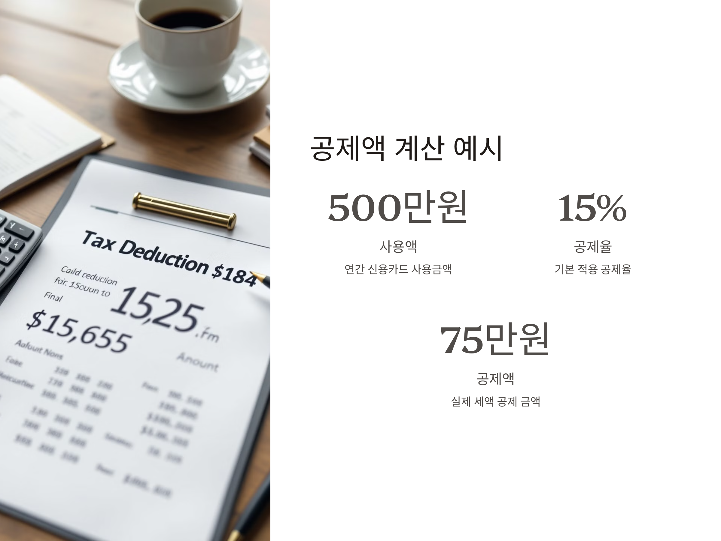 신용카드 공제 계산은 기본적으로 사용액에서 일정 비율을 곱한 금액이 공제액으로 산출됩니다. 예를 들어, 신용카드 사용액이 500만 원일 경우 15%의 공제를 받으면, 75만 원의 세액 공제가 이루어지게 됩니다.