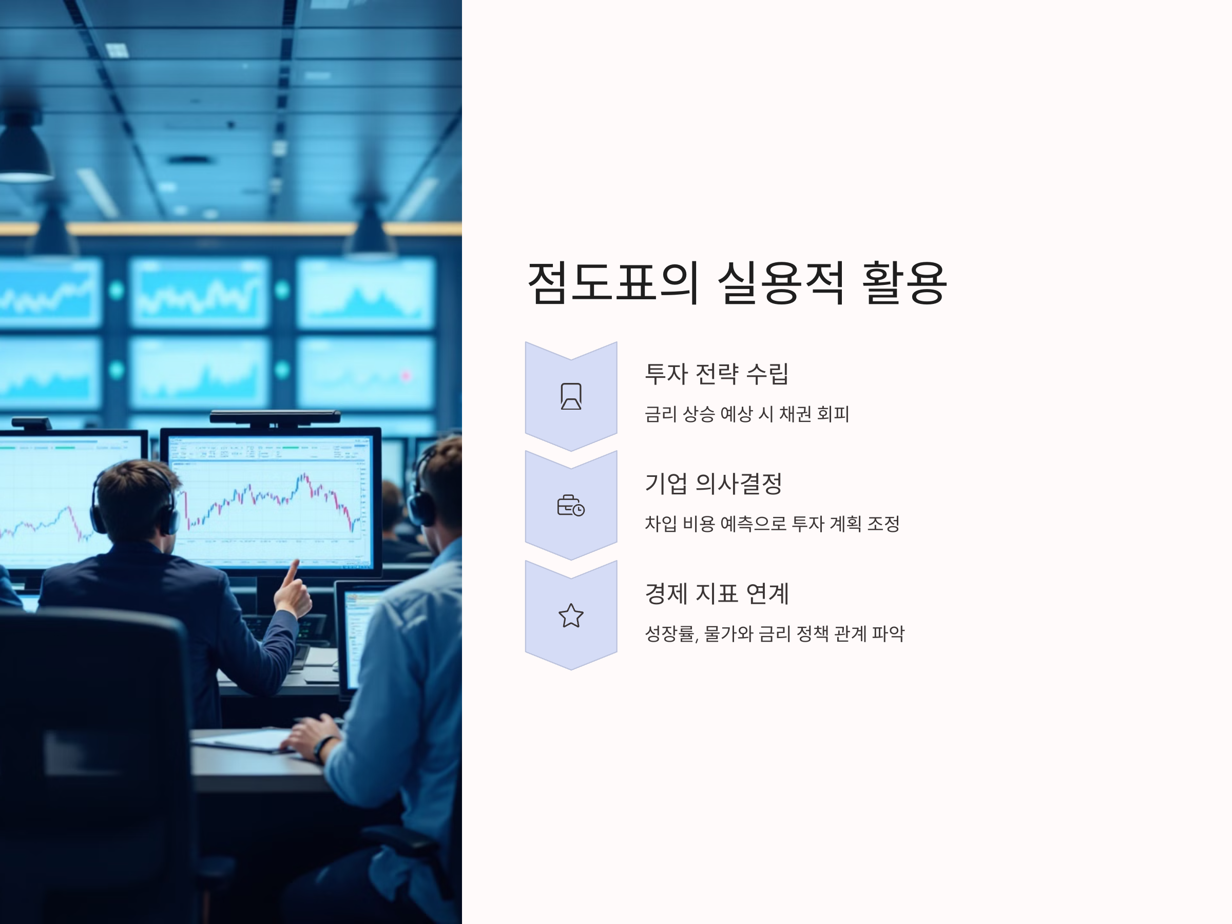 점도표는 투자자들, 경제학자들, 그리고 기업들이 연준의 금리 정책을 예측하고 그에 맞춘 전략을 세울 수 있도록 도와줍니다. 예를 들어, 금리가 상승할 것으로 예상되면, 자산 관리자는 금리가 민감한 자산군인 채권을 피하고 주식 시장으로 자금을 이동시킬 수 있습니다. 또한, 금리가 하락할 것으로 예상되면, 차입 비용이 줄어들어 소비와 투자 활동이 활발해질 수 있습니다.