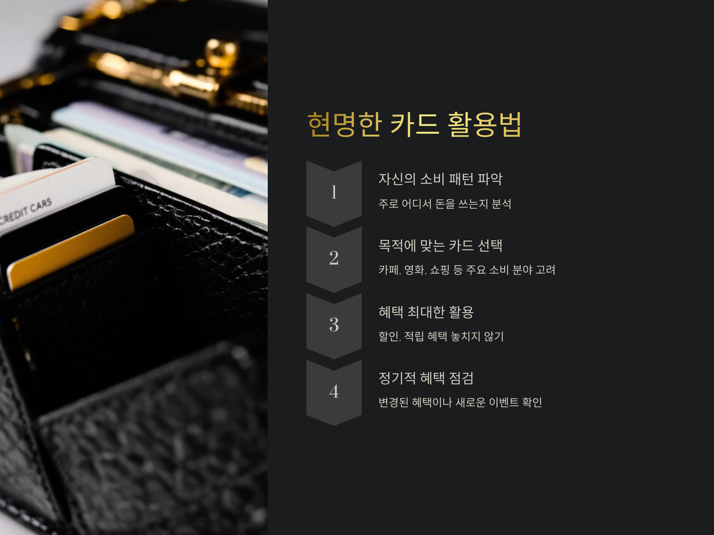 예를 들어, 커피를 자주 마시는 사람이라면 커피 할인 혜택이 있는 카드를 고르는 것이 좋고, 대중교통을 많이 이용하는 사람이라면 교통비 할인 혜택이 있는 카드를 선택하는 것이 유리합니다. 또한, 포인트 적립 프로그램을 활용하여 쇼핑몰에서 사용할 수 있는 포인트를 적립할 수 있는 카드도 매우 유용합니다.