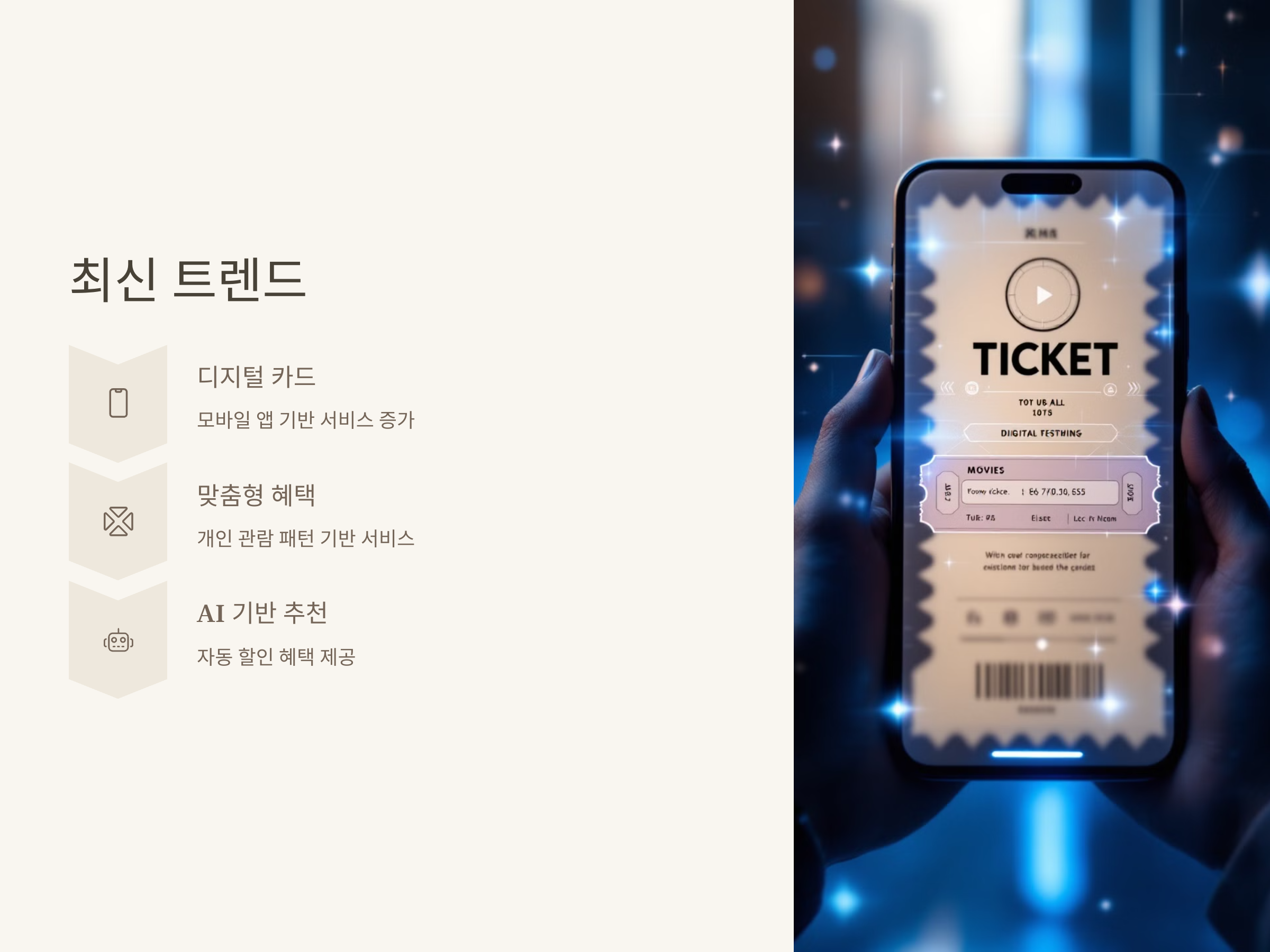 영화 할인 카드의 혜택은 계속해서 발전하고 있으며, 최근에는 디지털 카드나 앱 기반 서비스도 많이 등장하고 있습니다. 이러한 변화는 카드의 편리성을 높이고, 모바일 기기에서 바로 혜택을 누릴 수 있게 해주죠. 특히 영화 관람이 일상적인 활동으로 자리 잡으면서, 영화 할인 카드도 점차 다양화되고 있습니다. 앞으로는 AI 기반 추천 시스템이나 영화 예매 시 자동 할인 혜택을 제공하는 등의 혁신적인 서비스가 등장할 가능성도 높습니다.