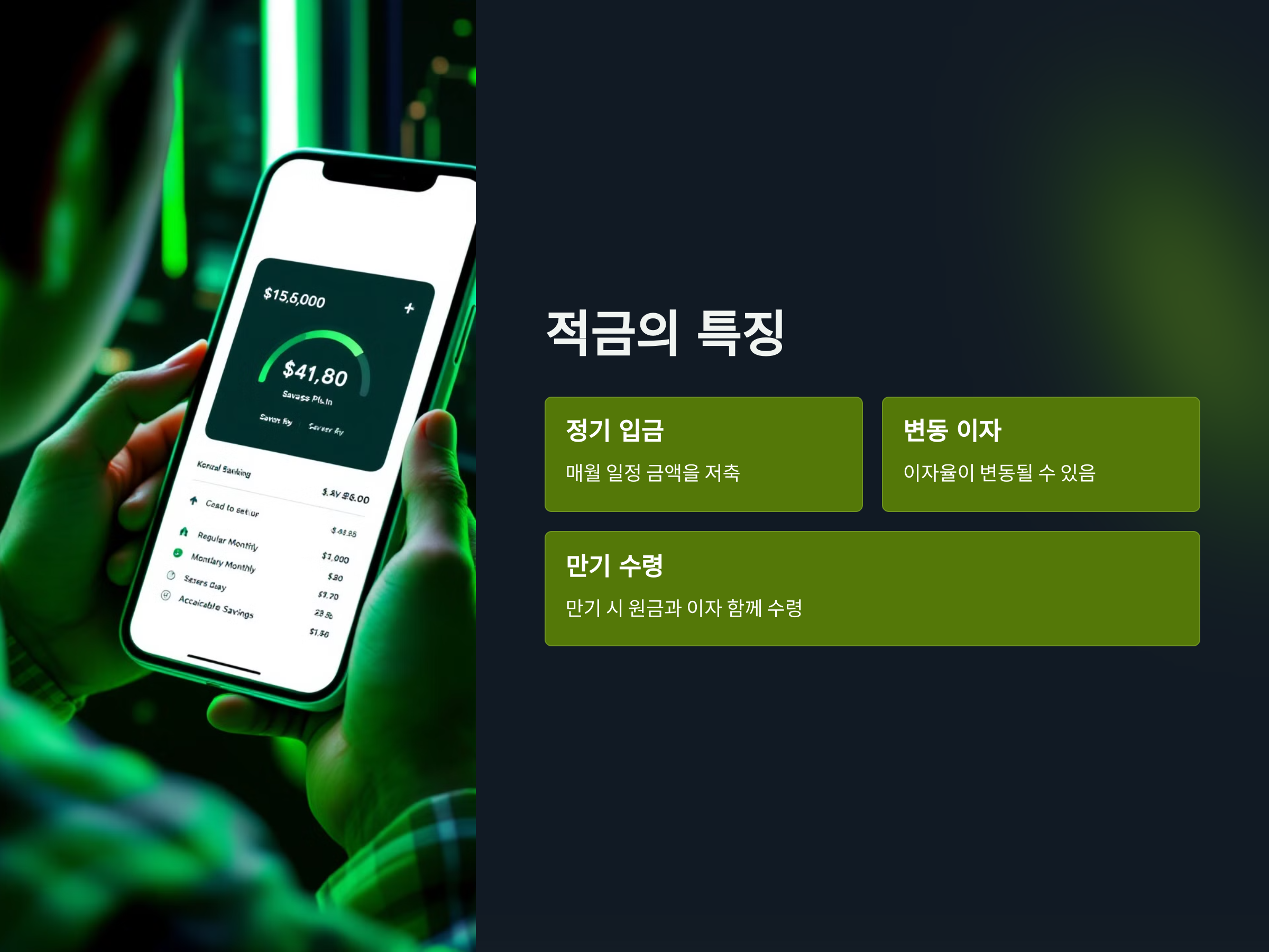 - 적금: 이자율은 변동적일 수 있으며, 만기 시 이자와 원금을 함께 수령