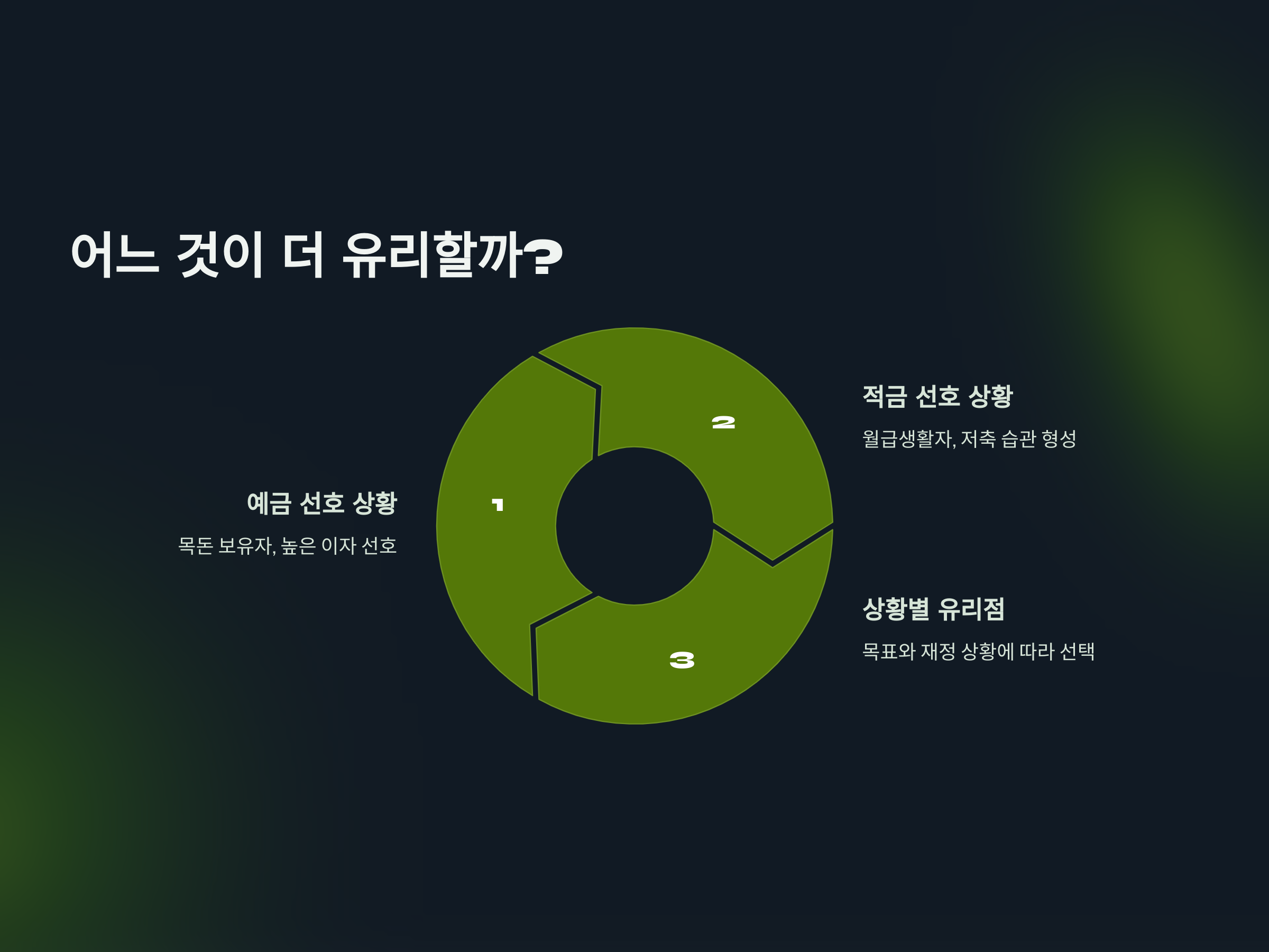 어떤 금융 상품이 더 유리한지는 목표와 상황에 따라 다릅니다. 예금은 큰 목돈을 예치할 수 있는 사람에게 적합하며, 예금 금리가 높은 상품을 고르면 상대적으로 더 많은 이자를 받을 수 있습니다. 그러나 예금은 입금이 한 번에 이루어지므로 갑자기 많은 돈을 준비할 수 있는 상황에서 유리합니다.