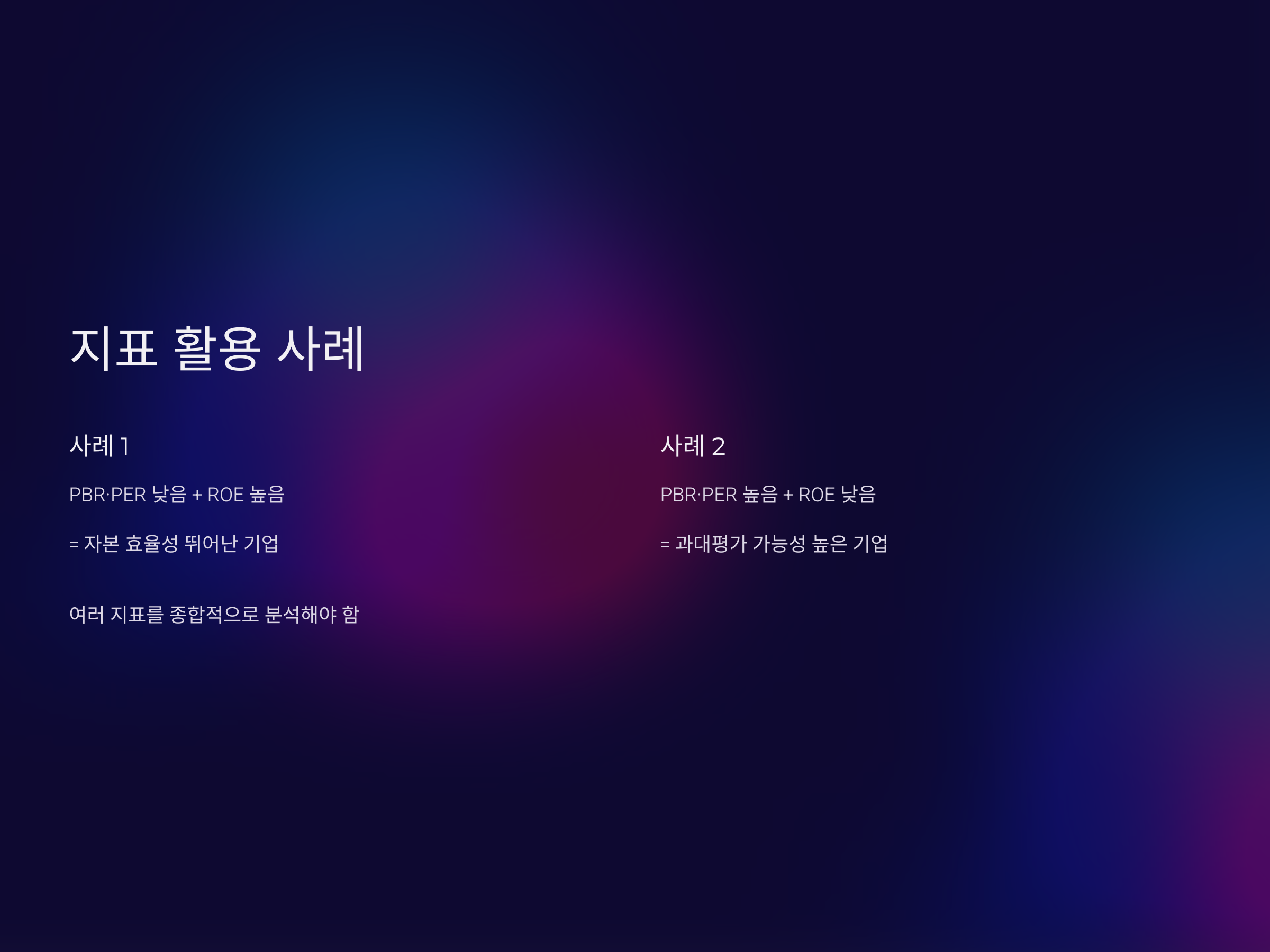 예를 들어, PBR과 PER이 모두 낮지만 ROE가 높다면, 해당 기업은 자산과 수익성은 다소 낮게 평가될 수 있지만 자본 효율성이 뛰어난 기업일 수 있습니다. 반대로, PBR과 PER이 높고 ROE가 낮다면, 해당 기업은 과대 평가되었을 가능성이 높습니다.