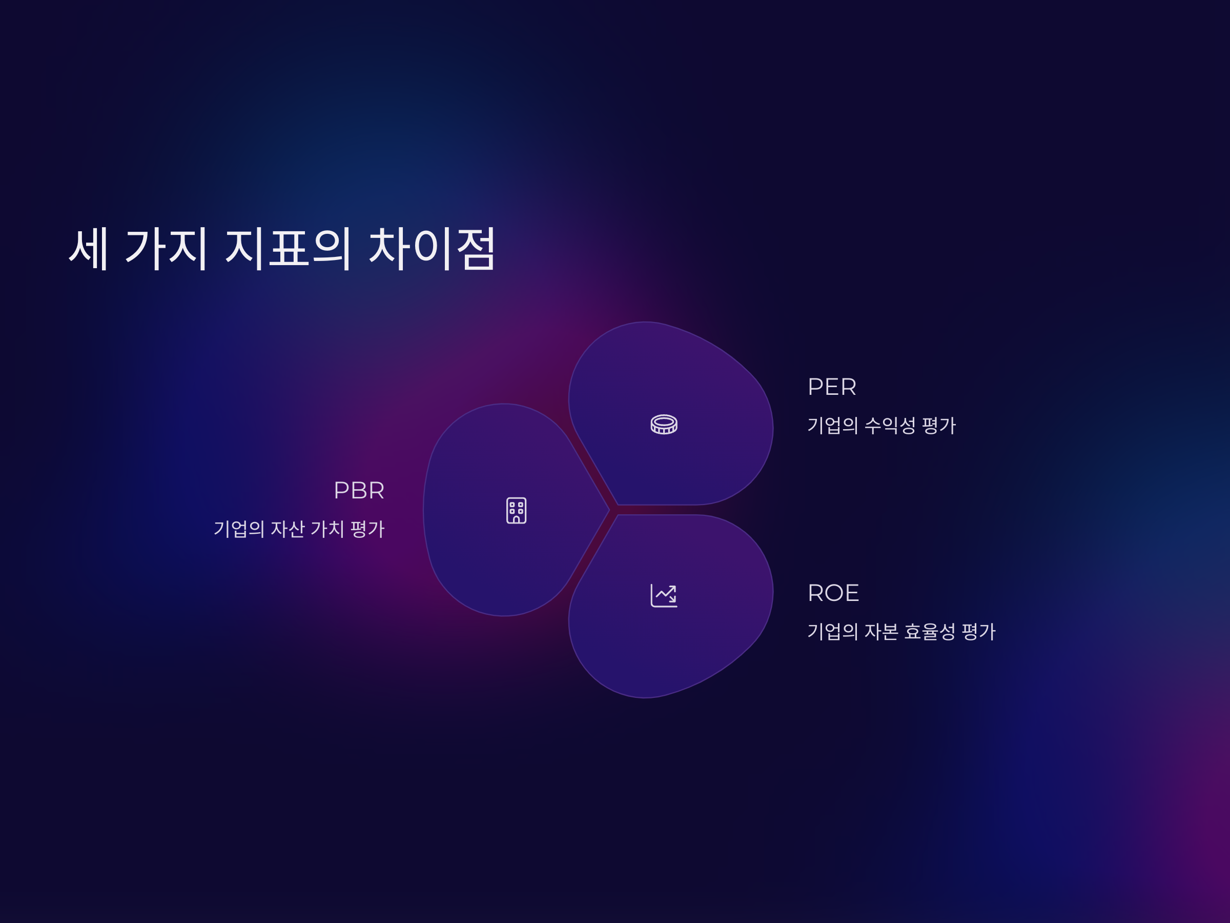 각각의 지표는 서로 다른 관점에서 기업을 평가합니다. PBR은 기업의 자산 가치를, PER은 기업의 수익성을, ROE는 기업의 자본 효율성을 평가하는 지표입니다. 투자자는 이들 지표를 함께 활용하여 종합적인 기업 분석을 할 수 있습니다.
