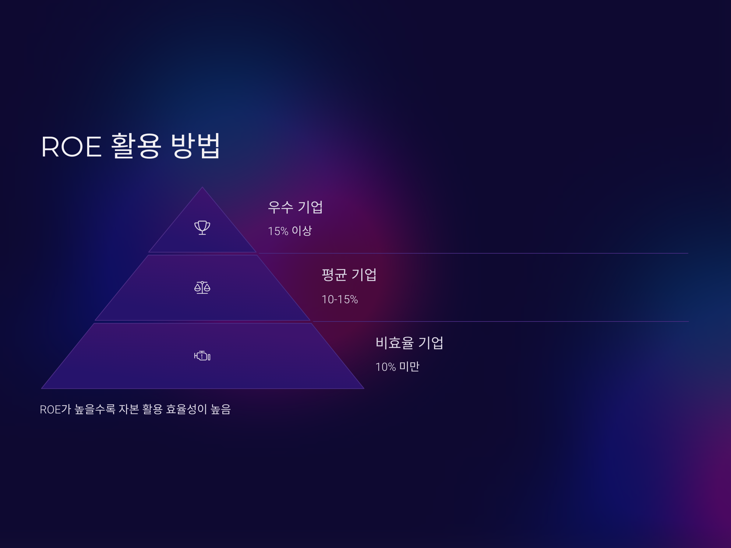 ROE를 통해 투자자는 기업이 자기자본을 얼마나 효율적으로 활용하는지를 평가할 수 있습니다. ROE가 높을수록 기업은 자본을 잘 활용하고 있다는 뜻이며, 낮을 경우 자본 활용에 비효율적일 수 있습니다. 일반적으로 ROE가 15% 이상인 기업은 자본을 효율적으로 운영하고 있다고 평가됩니다.