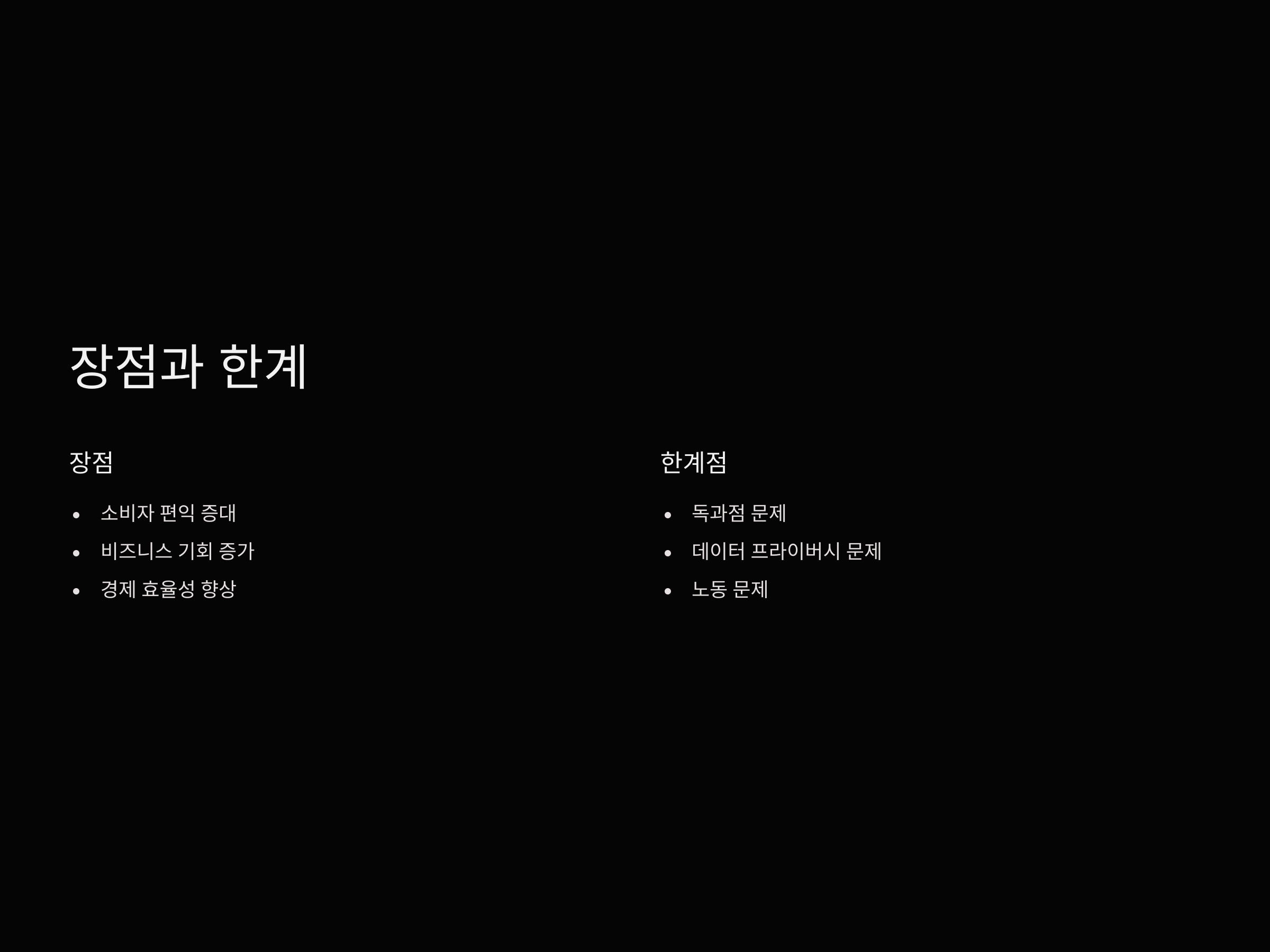 - 독과점 문제: 일부 대형 플랫폼 기업이 시장을 지배하여 경쟁이 제한된다.