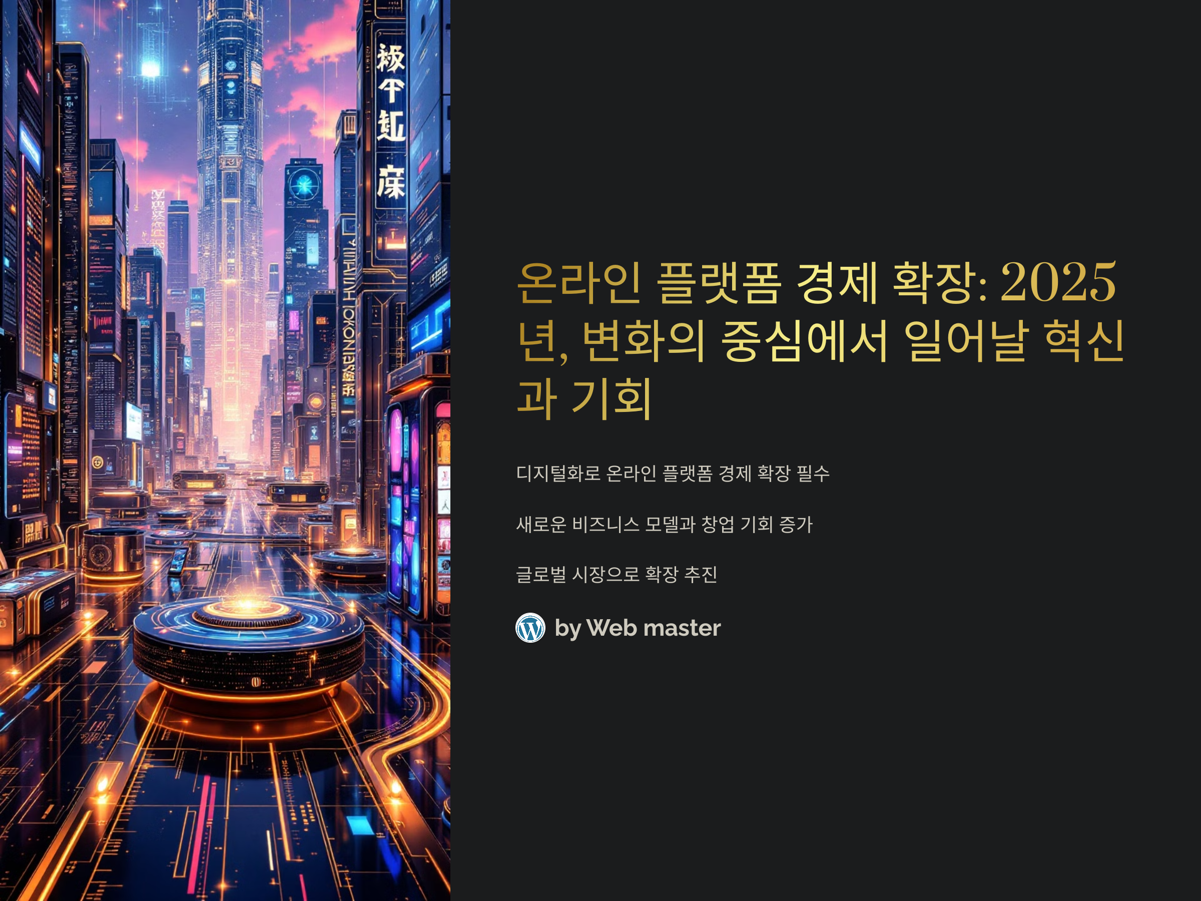 2025년, 온라인 플랫폼 경제의 확장은 단순한 경제 모델을 넘어서, 사람들의 삶과 사회 구조에 큰 영향을 미치게 될 것입니다. 이를 준비하기 위해서는 새로운 기술과 시장 변화에 빠르게 적응하는 것이 중요하며, 그에 따른 기회와 도전도 충분히 염두에 두어야 합니다. 여러분도 이 변화에 발맞춰 플랫폼 경제의 흐름을 잘 타고, 미래의 기회를 놓치지 않도록 하세