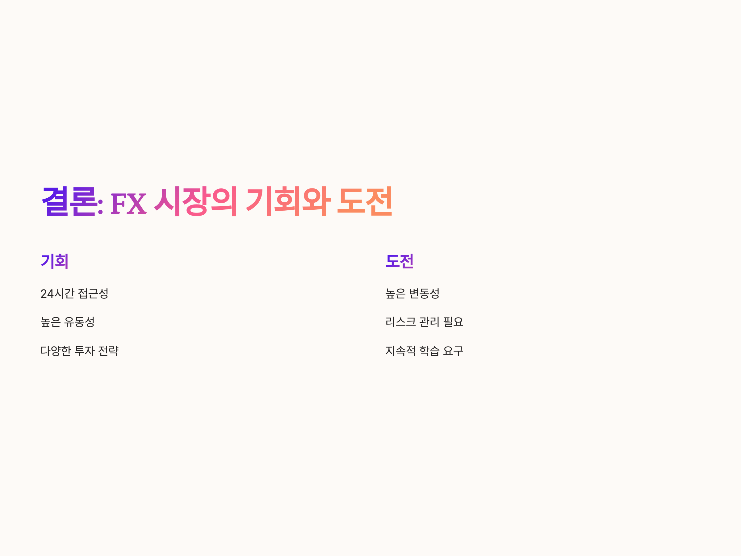 외환거래(FX)는 그 자체로 복잡하고 다양한 요소들이 얽혀 있는 시장이지만, 기본적인 개념을 이해하고 준비가 잘 되어 있다면 누구나 시작할 수 있는 기회입니다. 이 글을 통해 FX 시장에 대한 이해도를 높이고, 더 나은 투자 결정을 내리기 위한 첫걸음을 뗄 수 있기를 바랍니다.