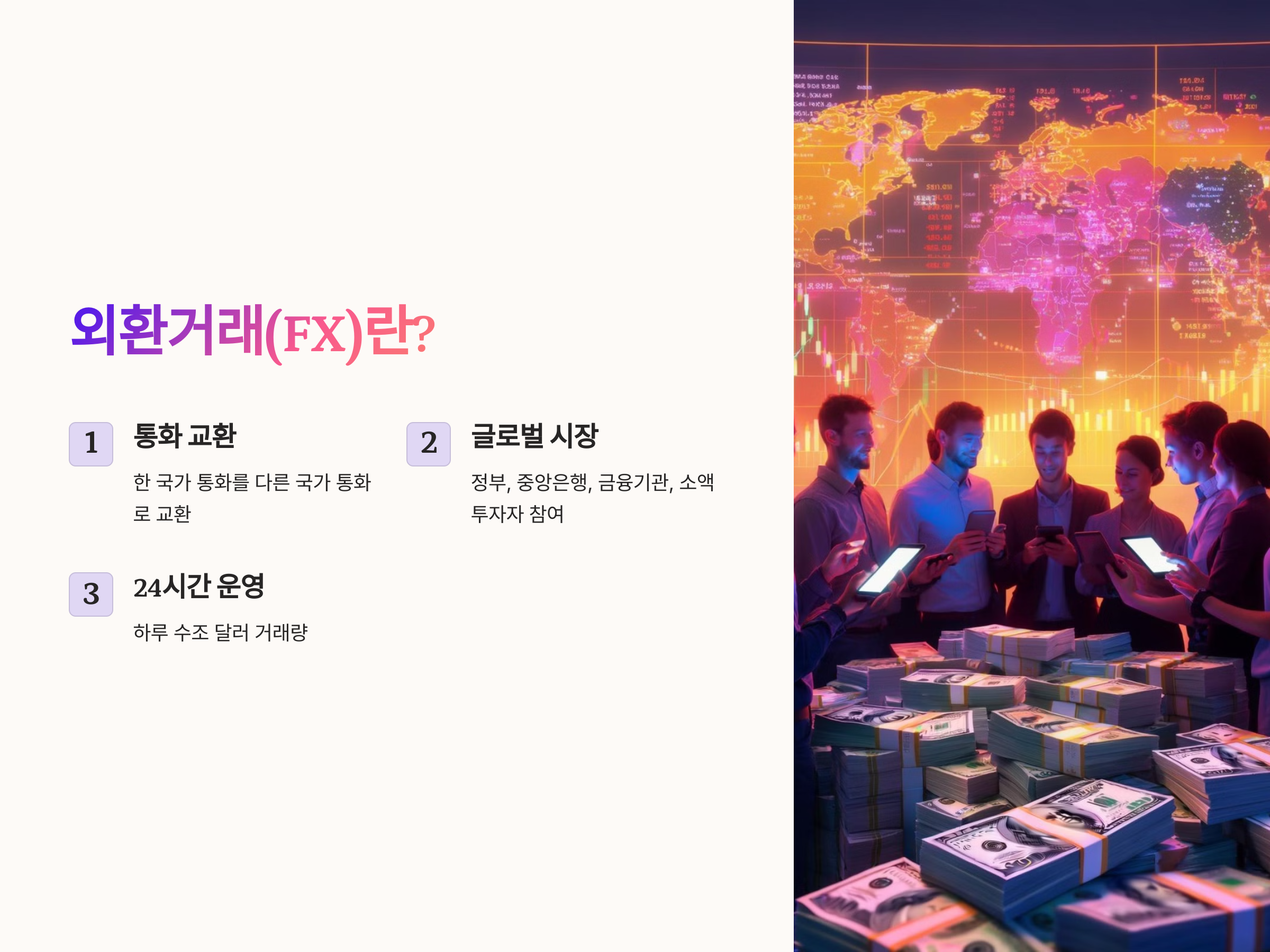 외환거래(FX)는 한 국가의 통화를 다른 국가의 통화로 교환하는 금융 거래를 의미합니다. 예를 들어, 1달러를 원화로 바꾸는 것이 외환거래의 일종입니다. 이러한 거래는 국제적인 자금 흐름을 원활하게 해주는 중요한 역할을 합니다. 외환거래 시장은 세계 각국의 정부, 중앙은행, 대형 금융기관, 그리고 최근에는 소액 투자자까지 참여하는 글로벌 시장입니다. 하루 24시간 운영되며, 거래량은 매일 수조 달러에 달합니다.