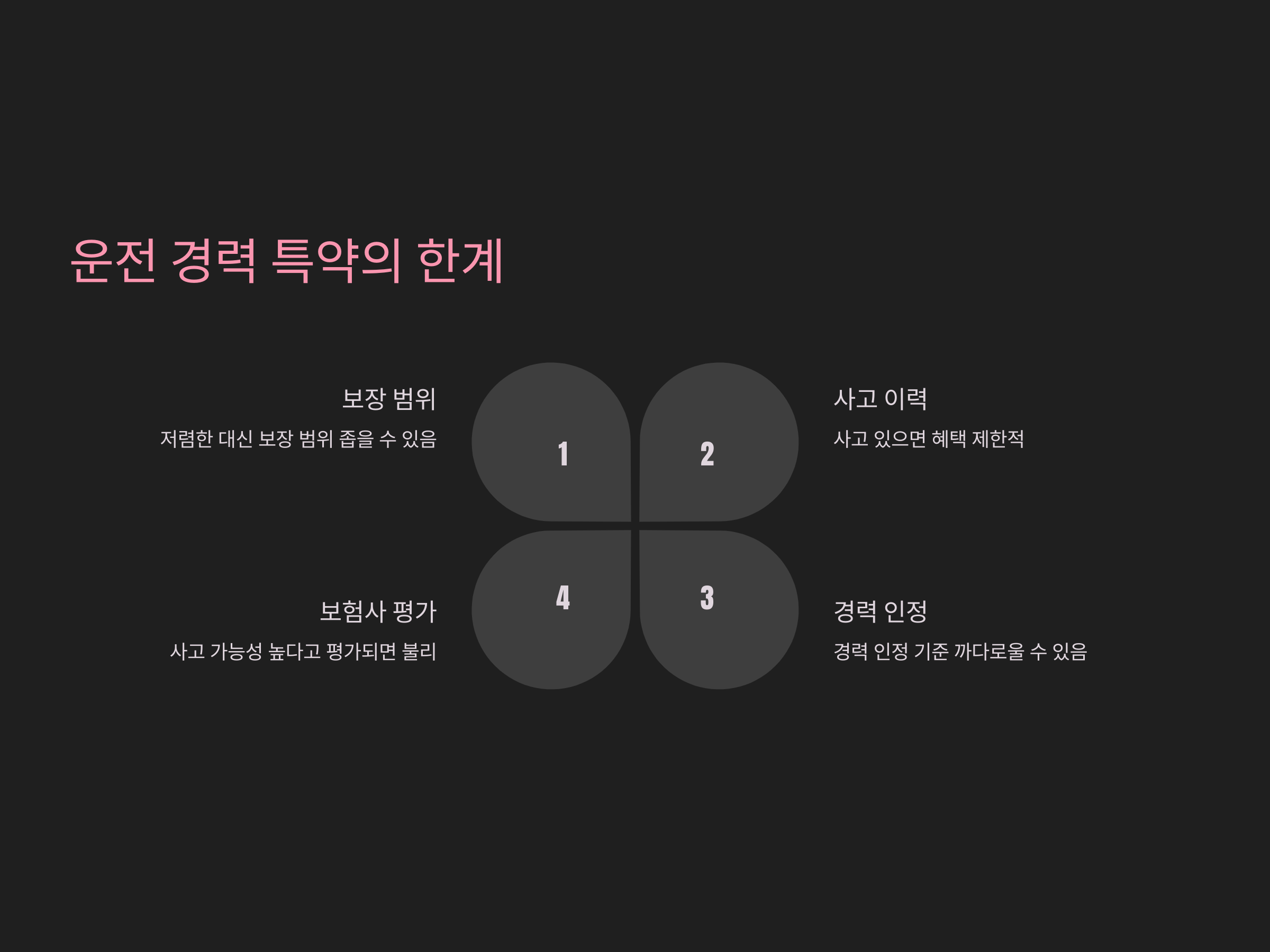 운전 경력 특약이 모든 운전자에게 완벽한 선택이 아닐 수 있습니다. 예를 들어, 보험료가 저렴한 대신 보장 범위가 좁은 경우도 있을 수 있습니다. 또한, 사고 이력이 있는 운전자는 경력 특약 혜택을 받기 어려울 수 있으므로, 이와 같은 경우에는 다른 특약을 고려하는 것이 좋습니다.