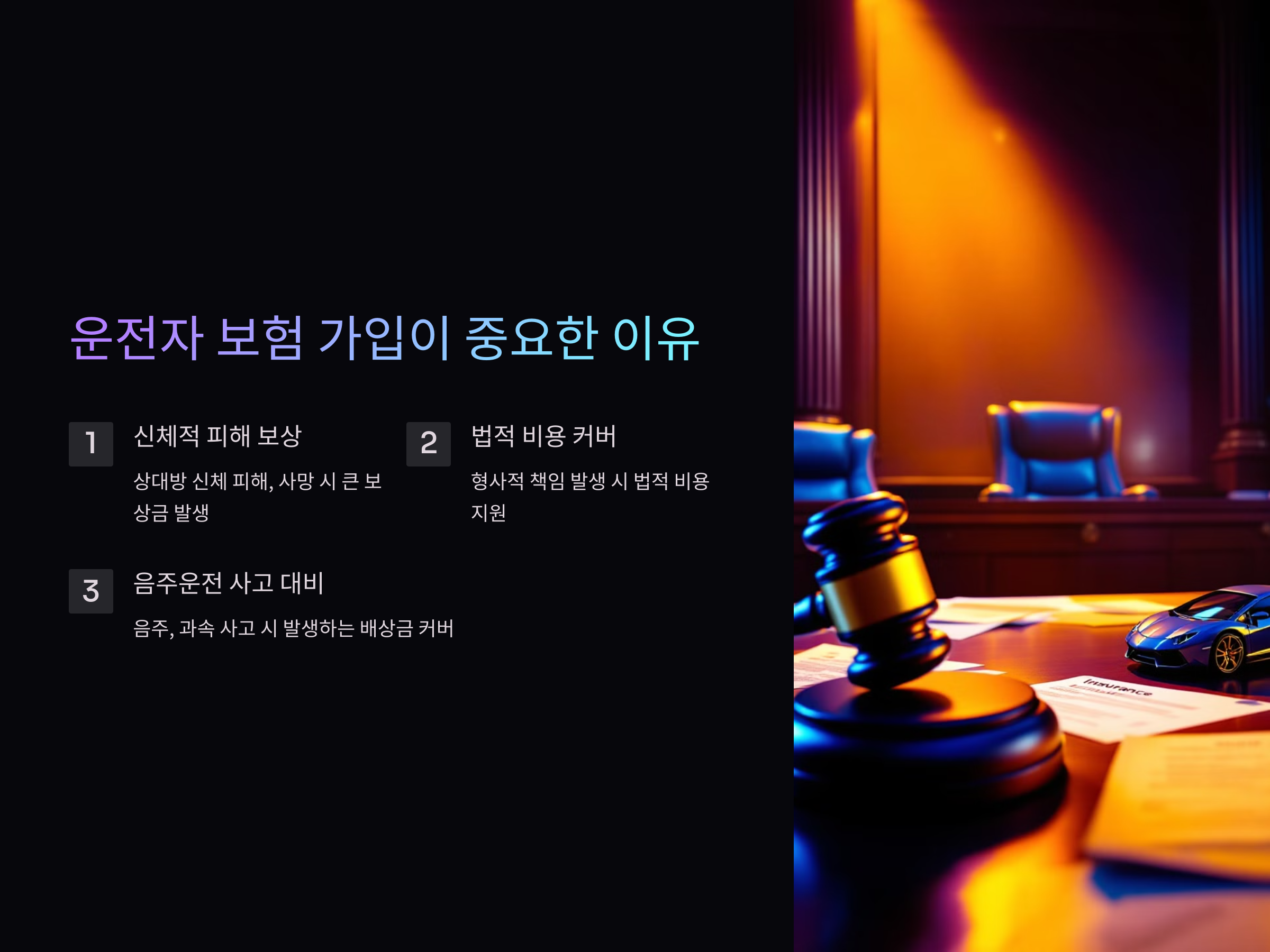 운전 중 사고를 일으켰을 때 발생할 수 있는 여러 위험 요소가 있기 때문에, 운전자 보험 가입이 꼭 필요합니다. 특히 사고로 인해 상대방에게 신체적 피해를 주거나, 피해자가 사망하는 경우, 민사적으로 큰 보상금을 물게 될 수 있습니다. 이럴 때 운전자 보험은 법적 비용과 치료비 등을 커버해줍니다.
