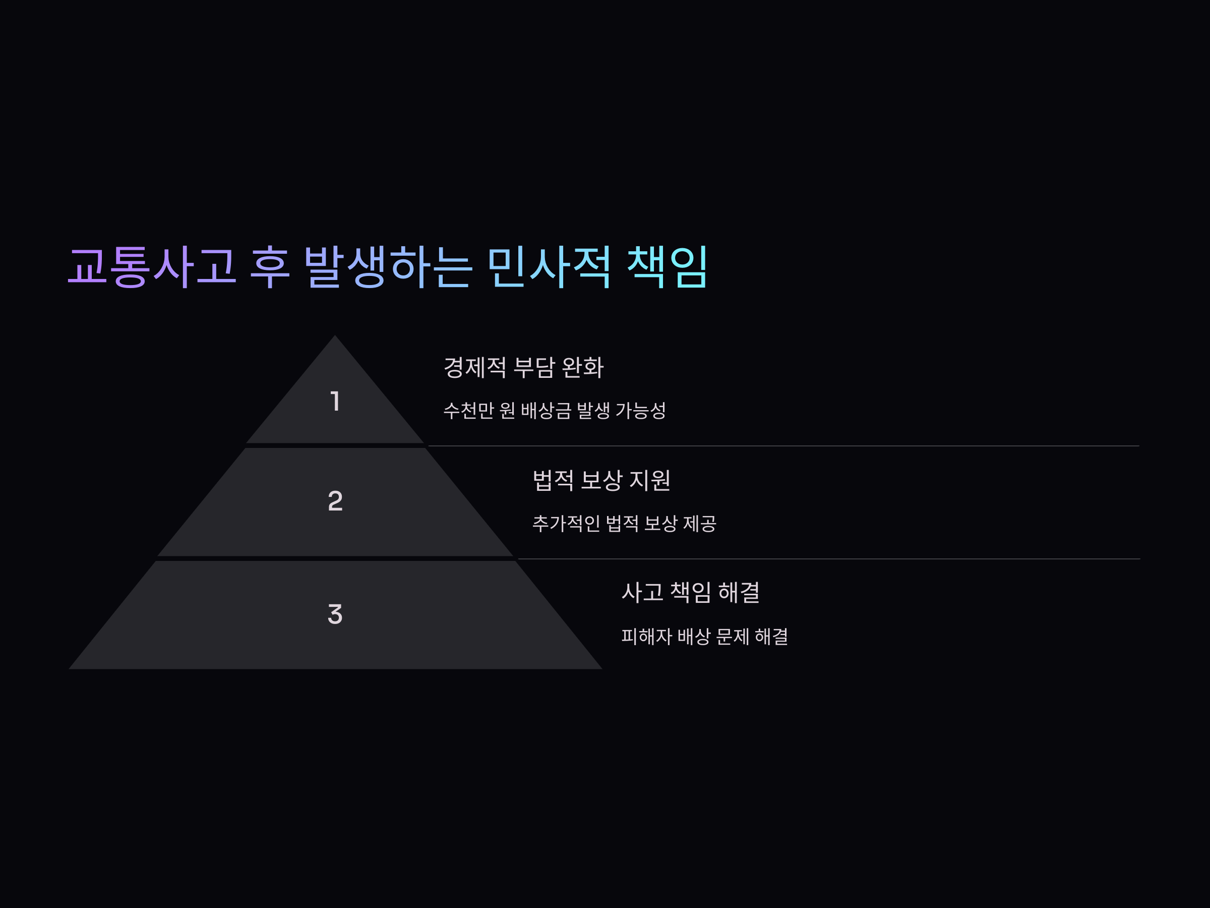 이러한 책임을 질 경우, 수백만 원에서 수천만 원에 달하는 배상금이 발생할 수 있으며, 이 비용을 직접 부담하는 것은 상당한 경제적 부담이 될 수 있습니다. 운전자 보험은 이러한 위험을 미리 대비하고 보장받을 수 있는 중요한 장치입니다.