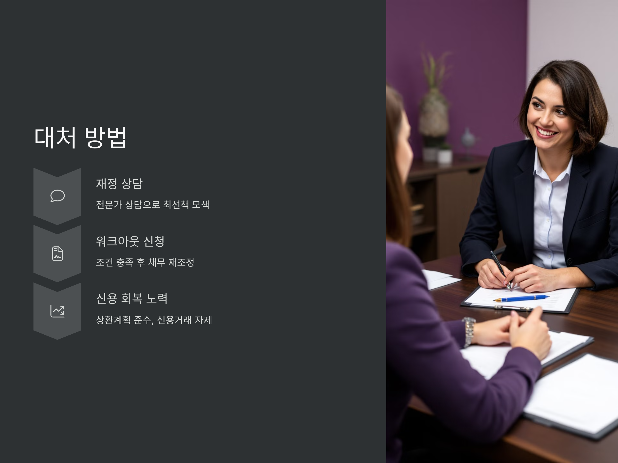 - 워크아웃 신청: 일정한 조건을 충족한 후 워크아웃을 신청할 수 있으며, 이를 통해 채무를 재조정하고 경제적 여유를 찾을 수 있습니다.