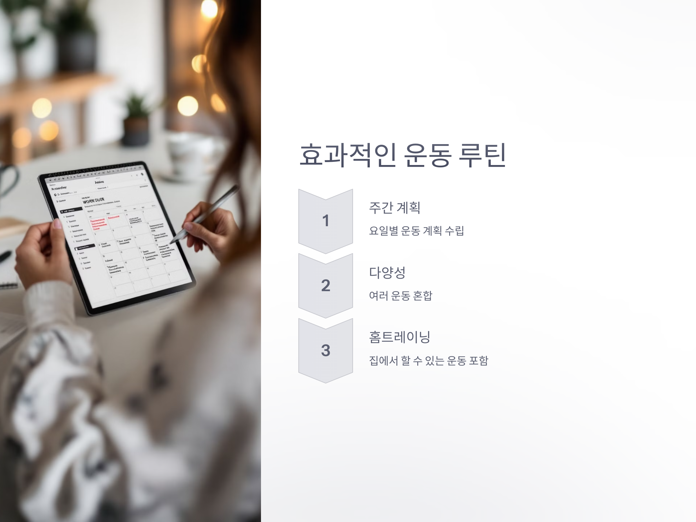 - 주간 운동 계획: 월요일은 상체 운동, 화요일은 하체 운동, 수요일은 유산소 운동, 목요일은 휴식과 같은 방식으로 일주일을 계획해보세요. 운동을 규칙적으로 하는 것이 중요합니다.
