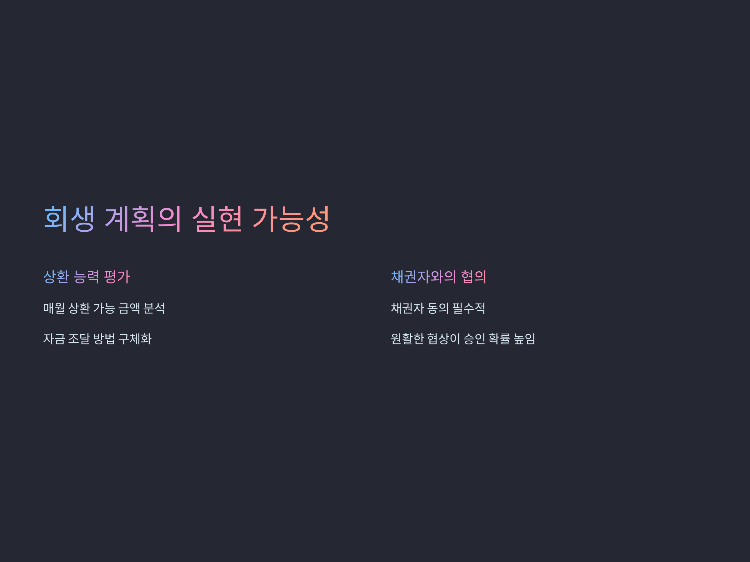 회생 계획의 실현 가능성은 워크아웃 승인 심사에서 또 다른 중요한 기준입니다. 채무자가 제시하는 회생 계획은 현실적이어야 하며, 실제로 채무자가 이를 실행할 수 있는 능력을 보여줘야 합니다. 워크아웃 승인은 채무자가 제출한 계획이 실현 가능한 경우에만 이루어지며, 이러한 계획에는 다음과 같은 요소들이 포함됩니다.