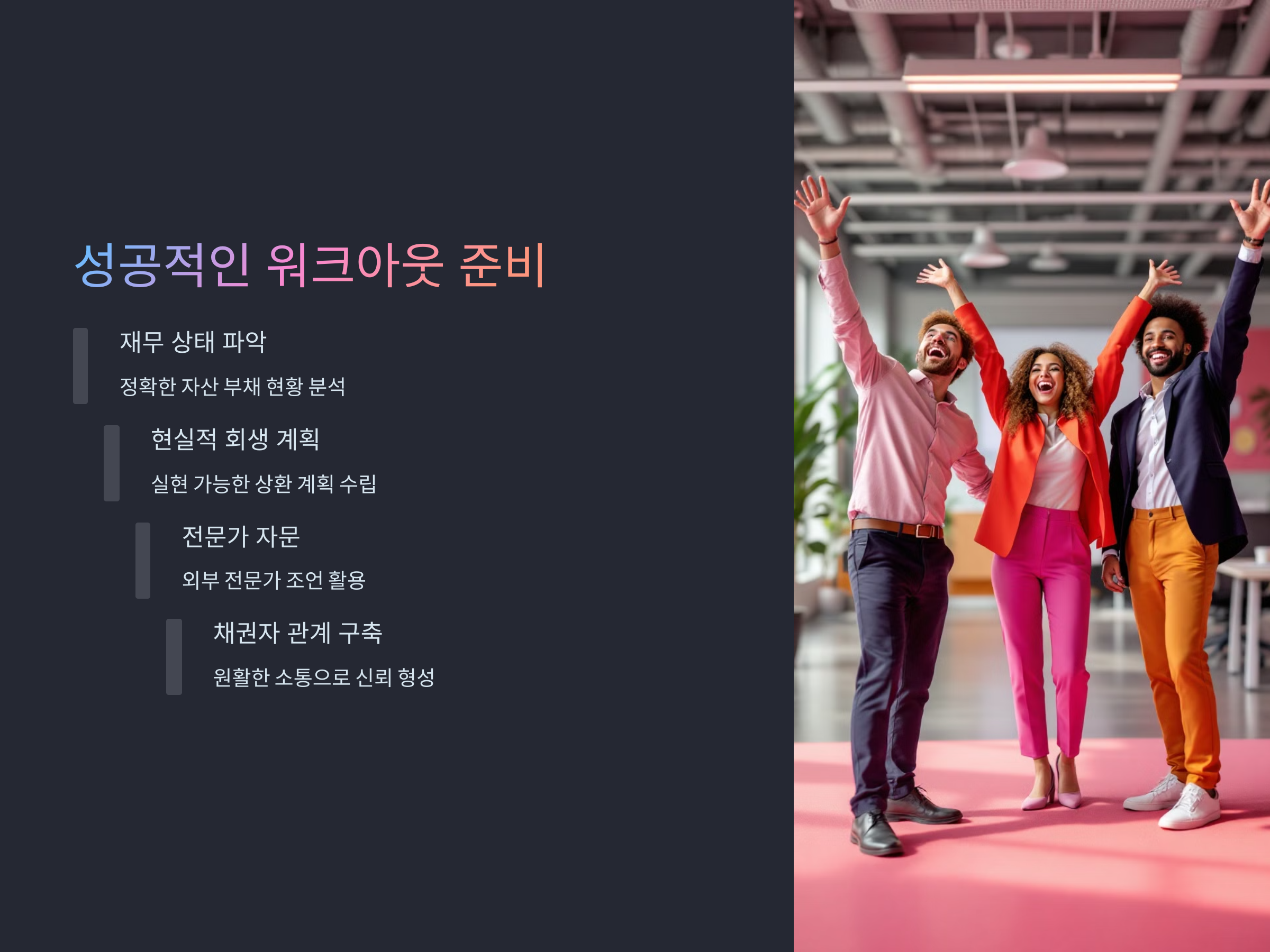 워크아웃 승인 심사를 준비하는 과정에서는 각 기준을 충분히 이해하고, 이에 맞는 전략을 수립하는 것이 중요합니다. 심사 기준에 맞춰서 실현 가능한 회생 계획을 준비하고, 채권자와의 협의를 원활하게 진행한다면, 워크아웃 승인을 받을 가능성을 높일 수 있습니다.