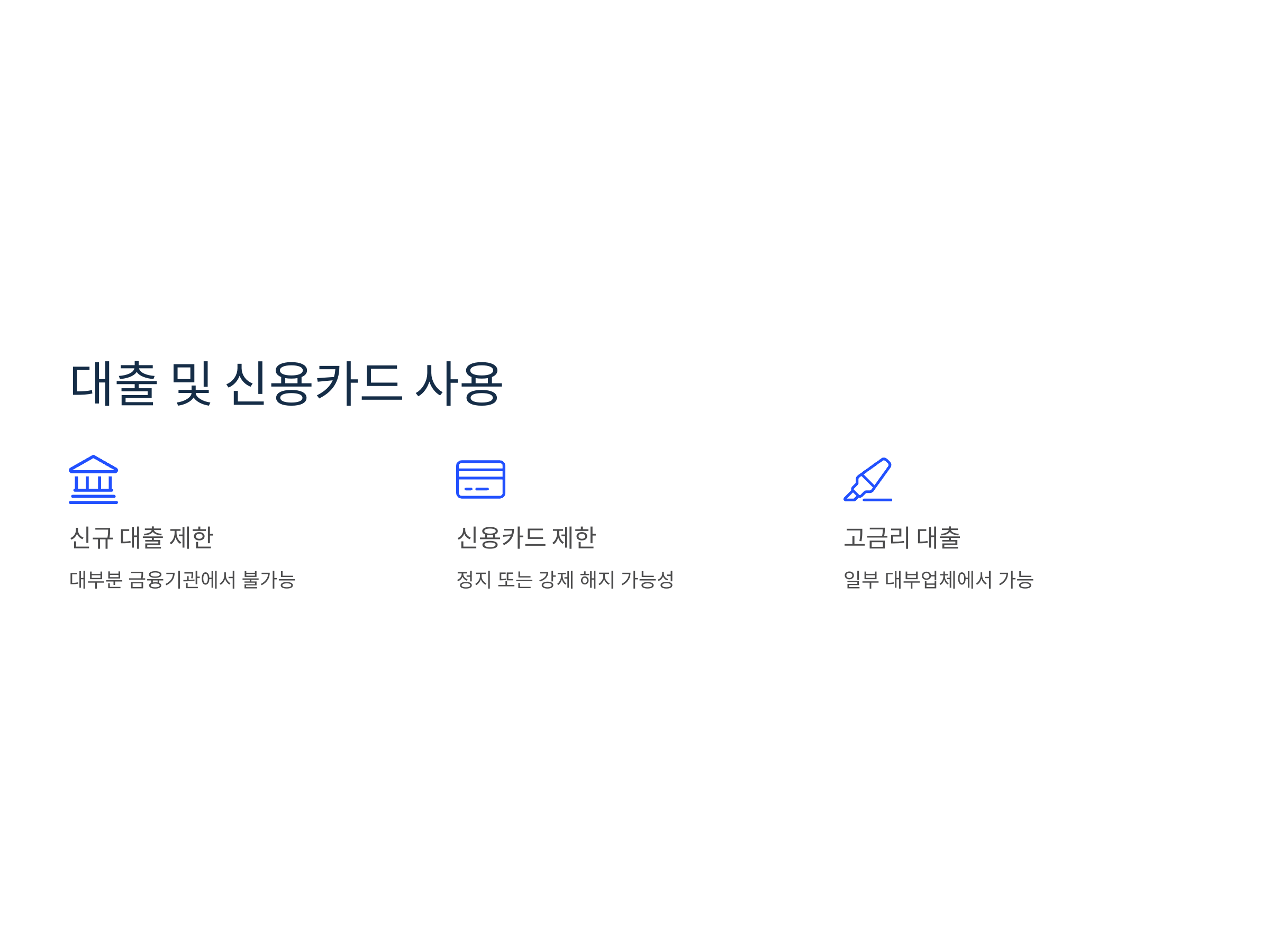- 신용카드 이용 제한: 신용카드는 정지되거나 강제 해지될 가능성이 높으며, 이후에도 재발급이 어려울 수 있습니다.