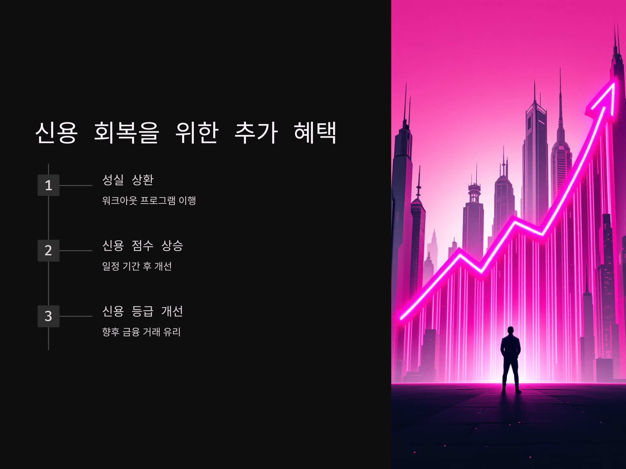 워크아웃 프로그램을 성실하게 이행하는 채무자에게는 신용 회복을 촉진하기 위한 추가 혜택이 주어질 수 있습니다. 예를 들어, 일정 기간 동안 성실하게 상환을 지속하면 신용 점수 상승이나 신용 등급 개선 등의 혜택을 받을 수 있습니다. 이는 향후 금융 거래 시 유리한 조건을 얻는 데 도움이 됩니다.