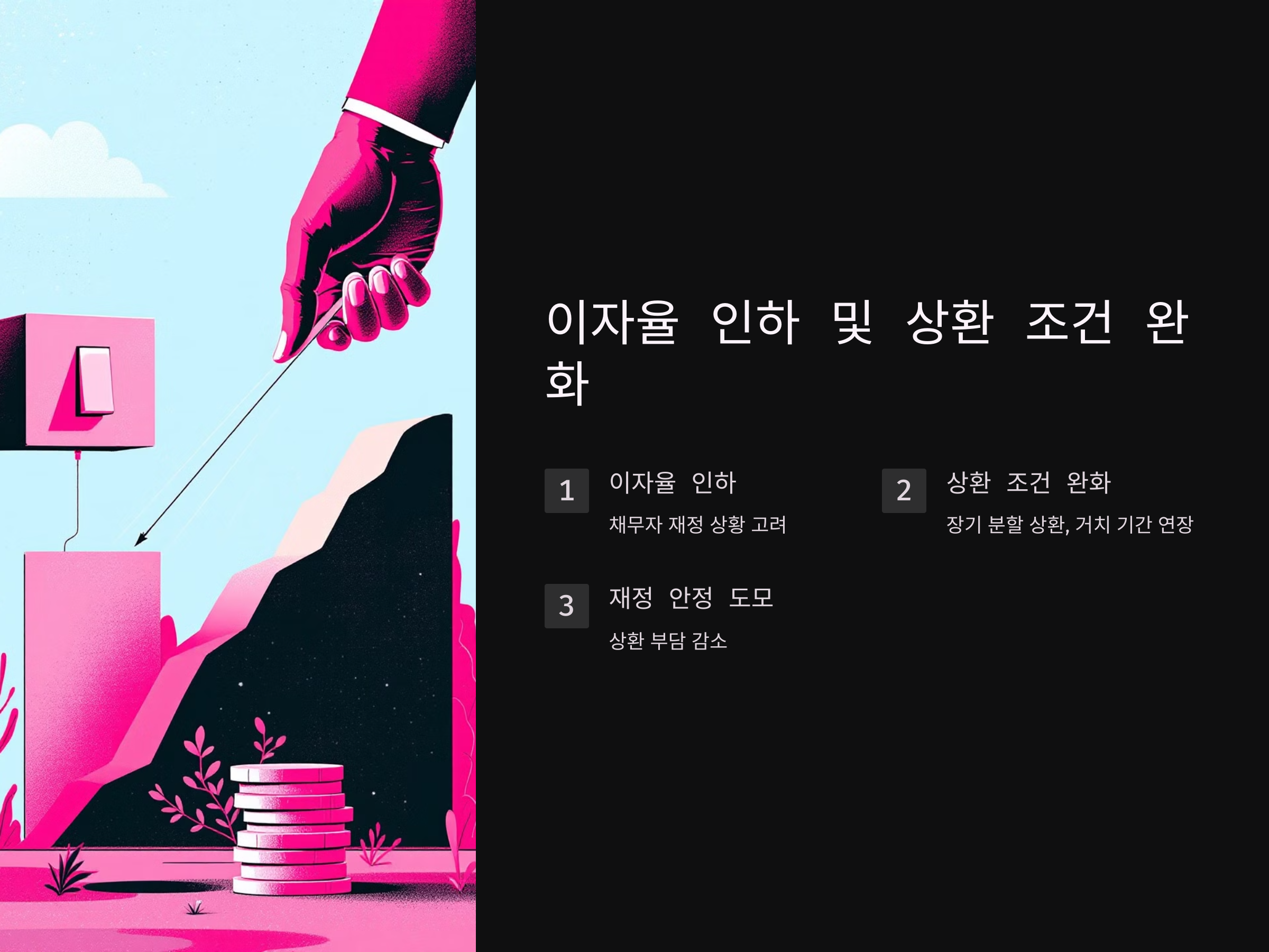 워크아웃 승인 후, 금융기관은 채무자의 재정 상황을 고려하여 이자율 인하나 상환 조건 완화 등의 혜택을 제공할 수 있습니다. 이러한 조치는 채무자의 상환 부담을 줄이고, 재정적인 안정을 도모하기 위한 것입니다. 특히, 장기 분할 상환이나 거치 기간 연장 등의 방법이 활용될 수 있습니다.