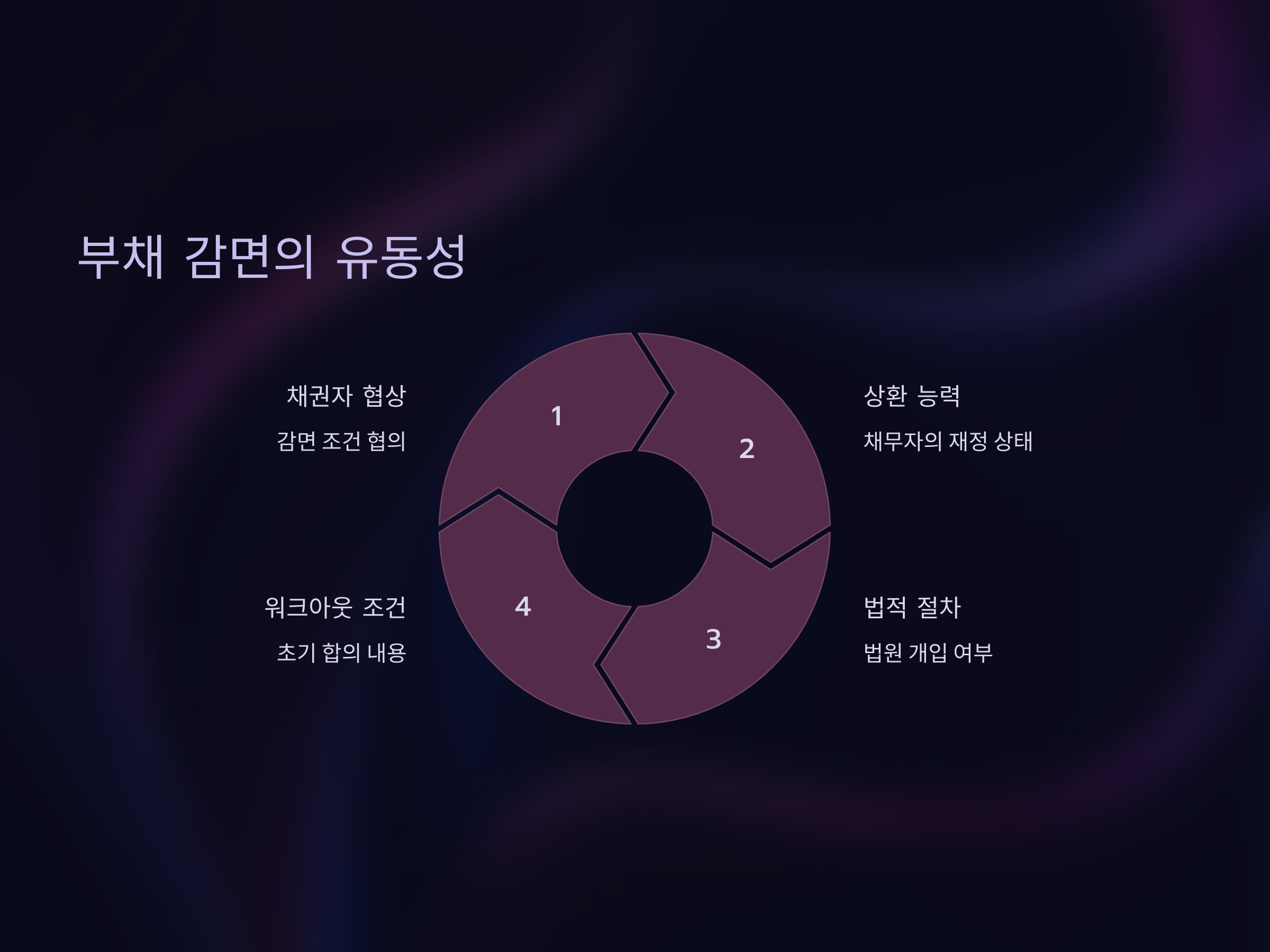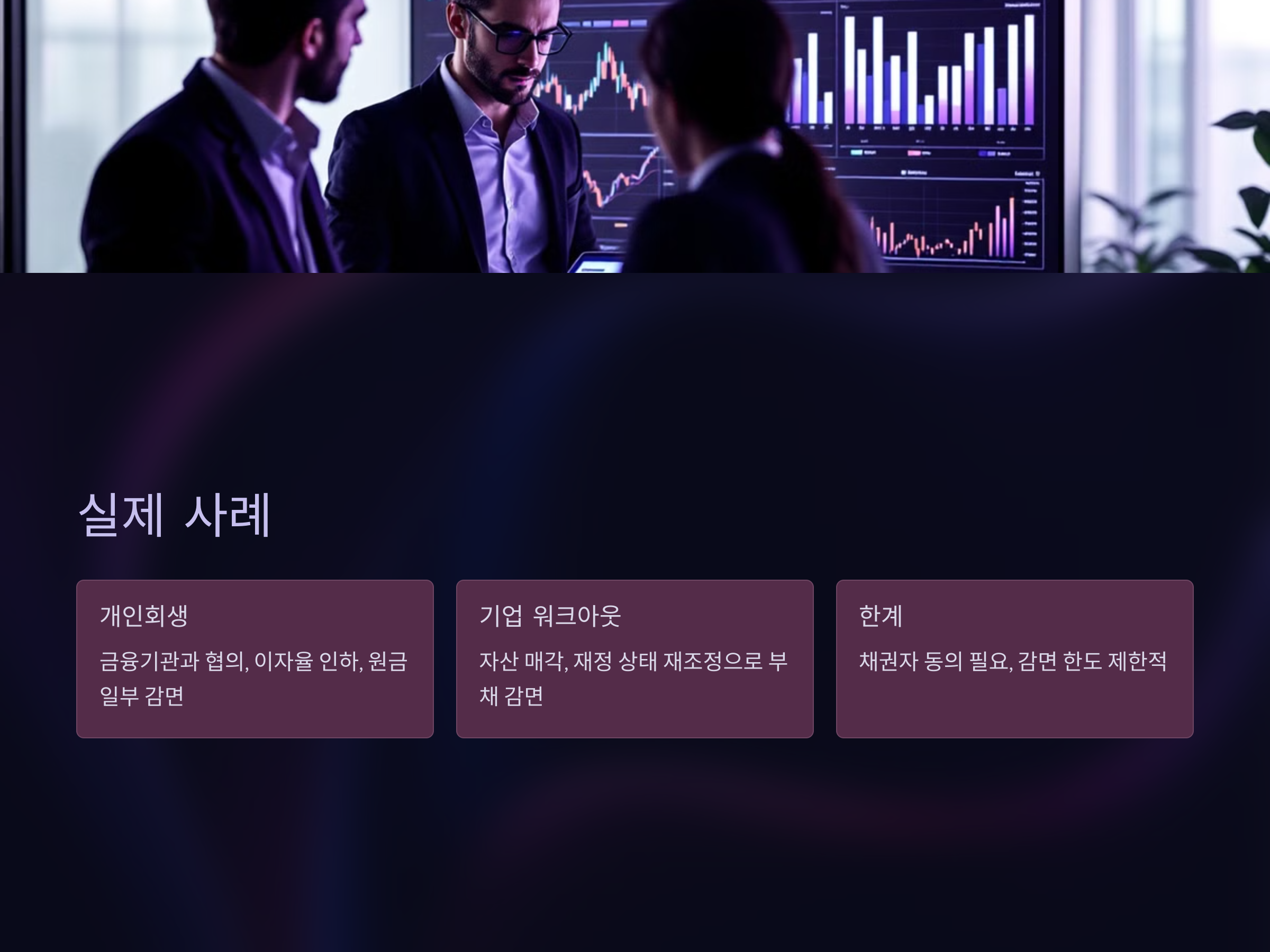- 채권자와의 합의: 채권자들이 채무자의 상환 능력에 맞추어 일부 원금이나 이자를 감면하는 경우