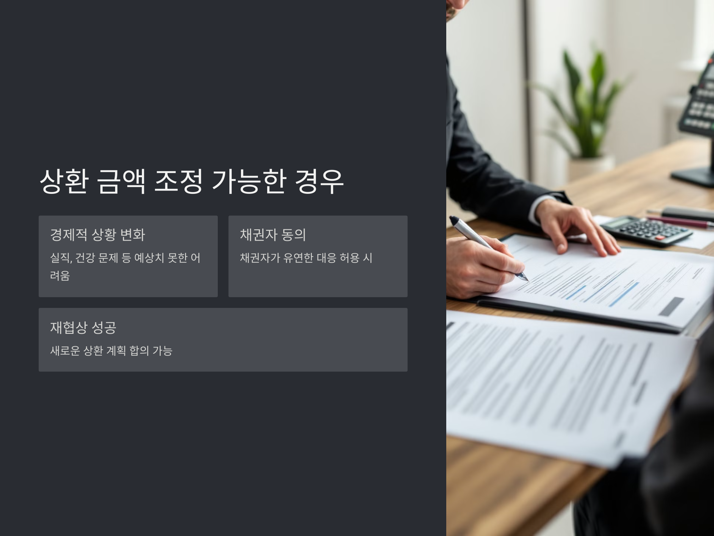 상환 금액을 조정할 수 있는 경우는 다음과 같습니다. 첫째, 채무자의 경제적 상황 변화가 있을 때입니다. 예를 들어, 예상치 못한 실직이나 건강상의 문제 등으로 인해 상환이 어려워진 경우, 채무자는 채권자와 재협상을 통해 상환 금액을 재조정할 수 있습니다. 둘째, 채권자의 동의가 있을 경우에도 상환 금액을 조정할 수 있습니다. 워크아웃을 진행하는 과정에서 채권자는 채무자의 상황을 고려하여 유연한 대응을 할 수 있으며, 상환 금액을 임시로 조정하거나, 일부 면제를 해줄 수도 있습니다.