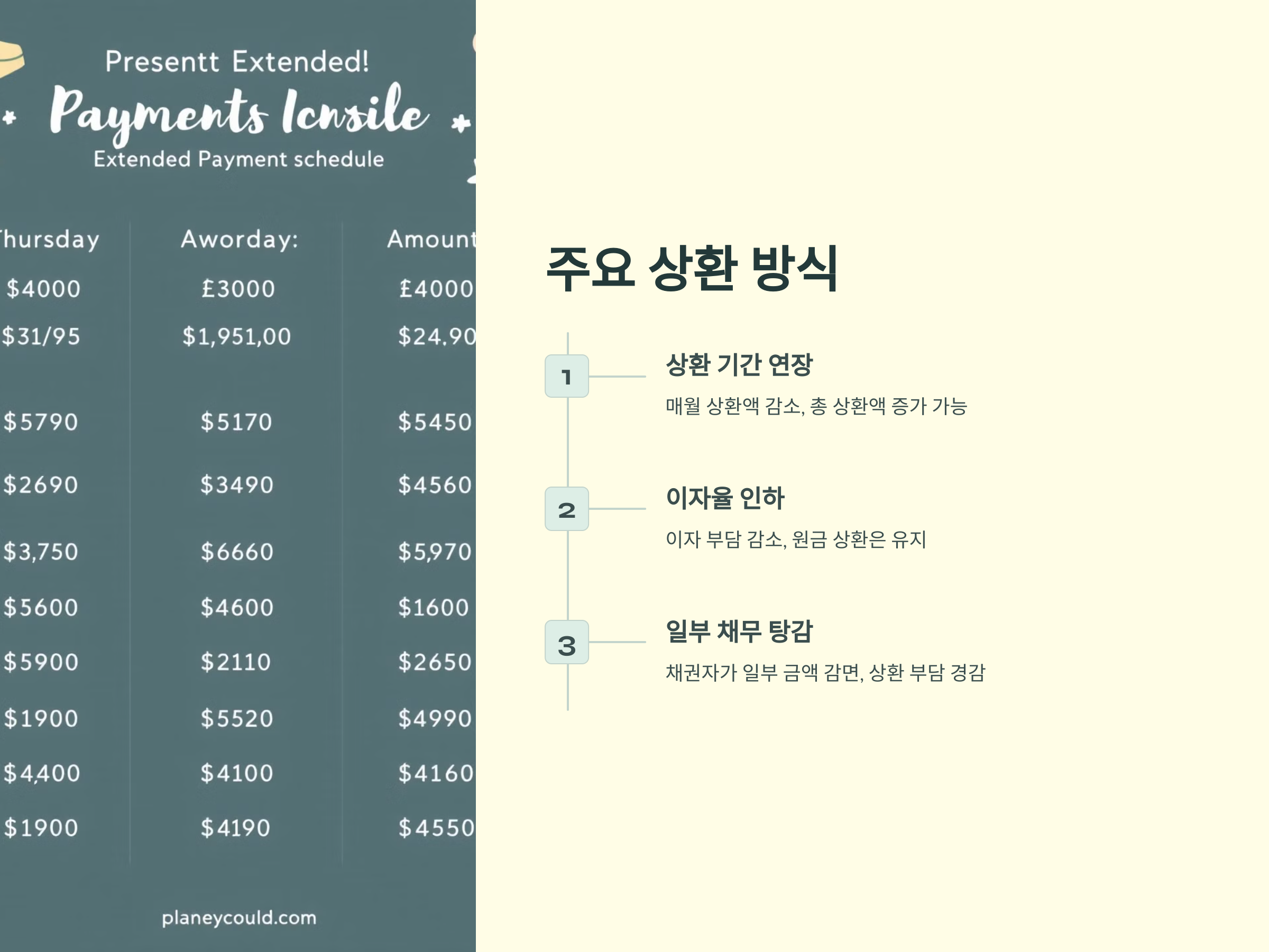 채무자가 경제적 어려움을 겪고 있을 때, 상환 기간을 연장하여 매월 상환해야 하는 금액을 줄이는 방식입니다. 이 방식은 매월 상환해야 하는 금액을 줄여 채무자가 경제적인 부담을 덜 수 있도록 돕습니다. 단, 상환 기간이 길어지기 때문에 총 상환해야 하는 금액은 늘어날 수 있습니다.