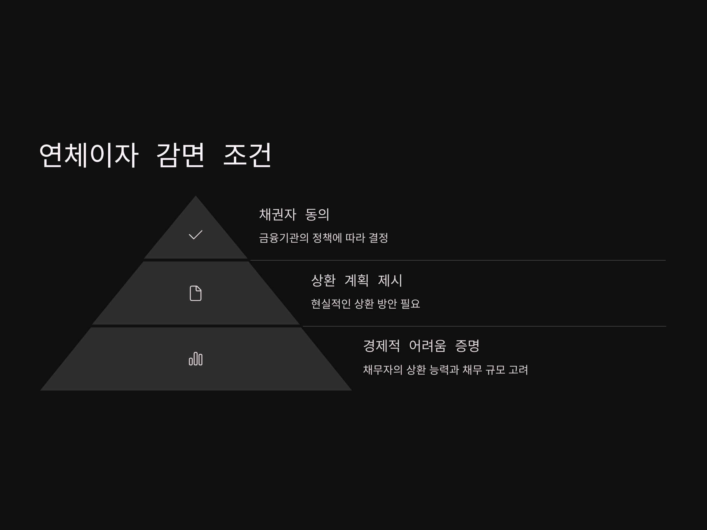 연체이자 감면 여부는 워크아웃을 진행하는 채권자의 의사와 채무자의 상황에 따라 달라집니다. 일반적으로 연체이자 감면이 이루어지려면 일정한 조건을 충족해야 합니다. 그 중 가장 중요한 조건은 채무자의 상환 능력과 채무의 규모입니다. 만약 채무자가 이미 상당한 수준의 경제적 어려움을 겪고 있다면, 금융기관은 연체이자 감면에 동의할 가능성이 높습니다.