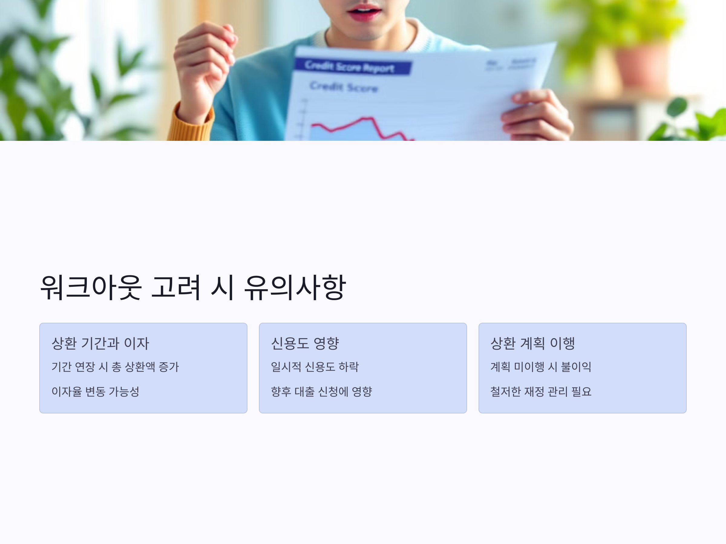워크아웃을 통해 상환 기간이 늘어나게 되면, 최종적으로 상환하는 금액이 더 많아질 수 있습니다. 즉, 이자 부담이 커질 수 있으므로, 상환 기간을 늘리는 것이 실제로 유리한지 따져볼 필요가 있습니다. 또한, 워크아웃을 신청한 후에도 이자율이 높아질 수 있으므로, 그 부분도 충분히 고려해야 합니다.