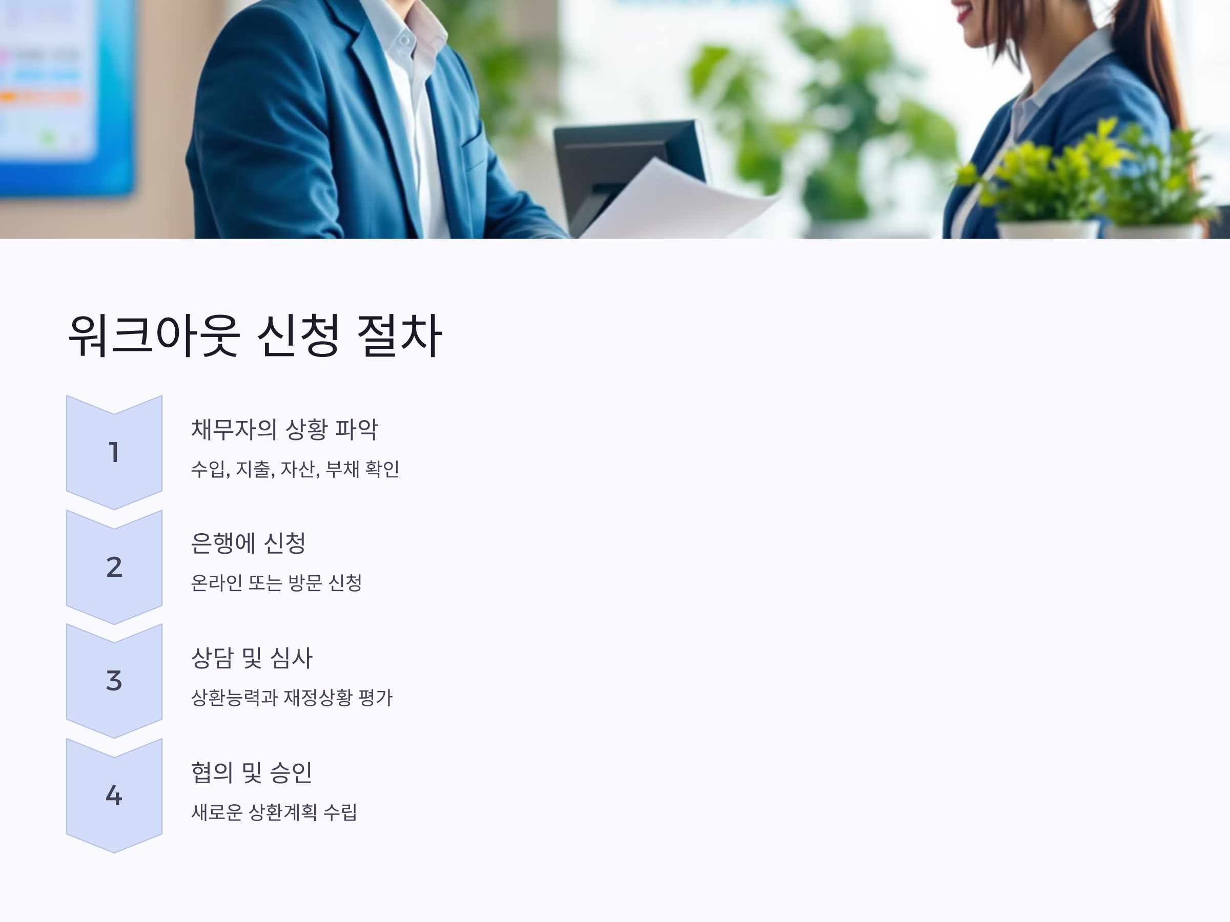- 상담 및 심사: 신청서를 제출한 후, 은행은 채무자의 상환 능력과 재정 상황을 평가합니다. 이에 따라 워크아웃 조건이 제시됩니다.