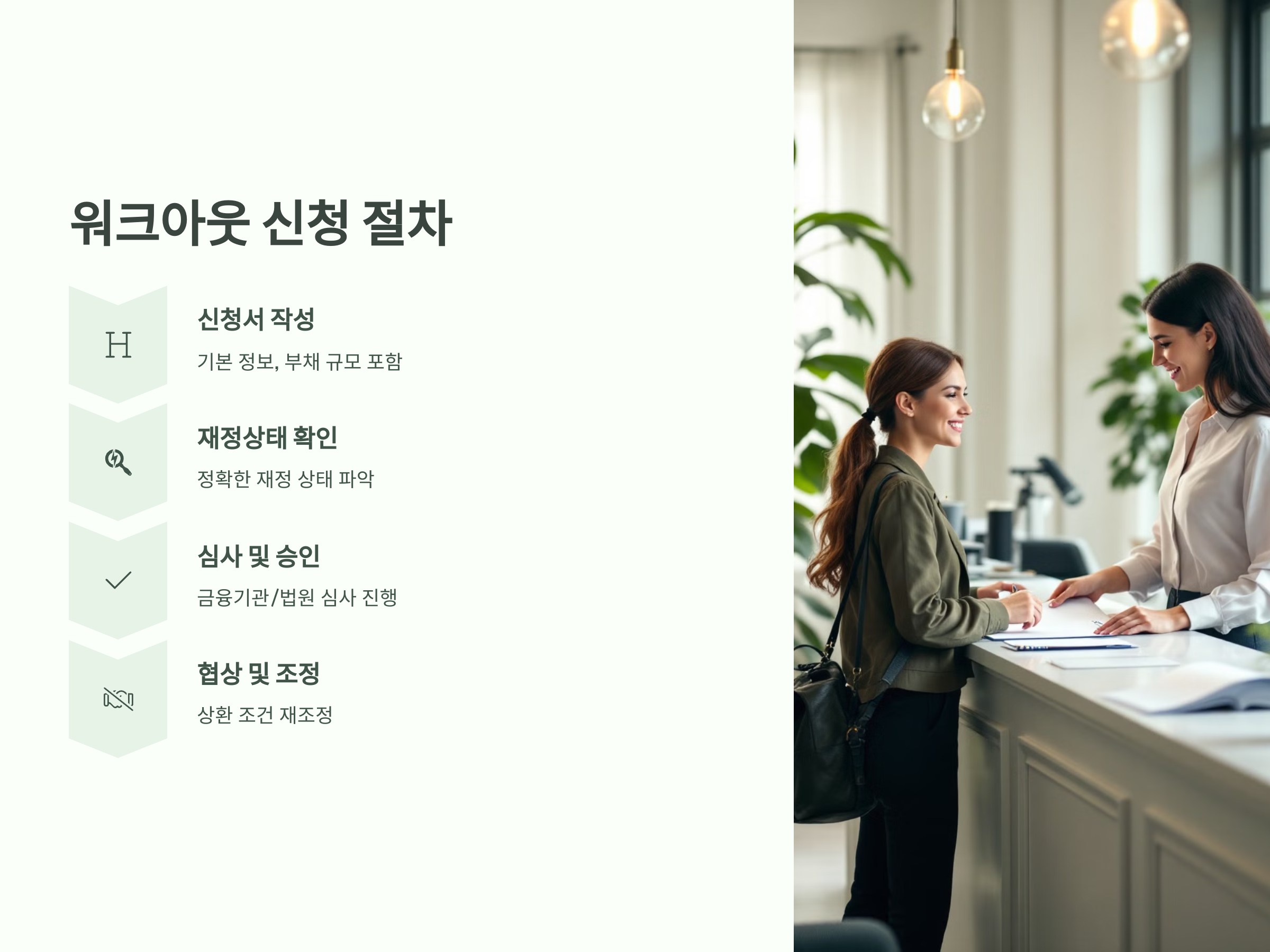 워크아웃을 신청하는 절차는 비교적 간단하지만, 준비가 필요합니다. 신청자가 워크아웃을 신청하려면, 다음과 같은 절차를 거쳐야 합니다: