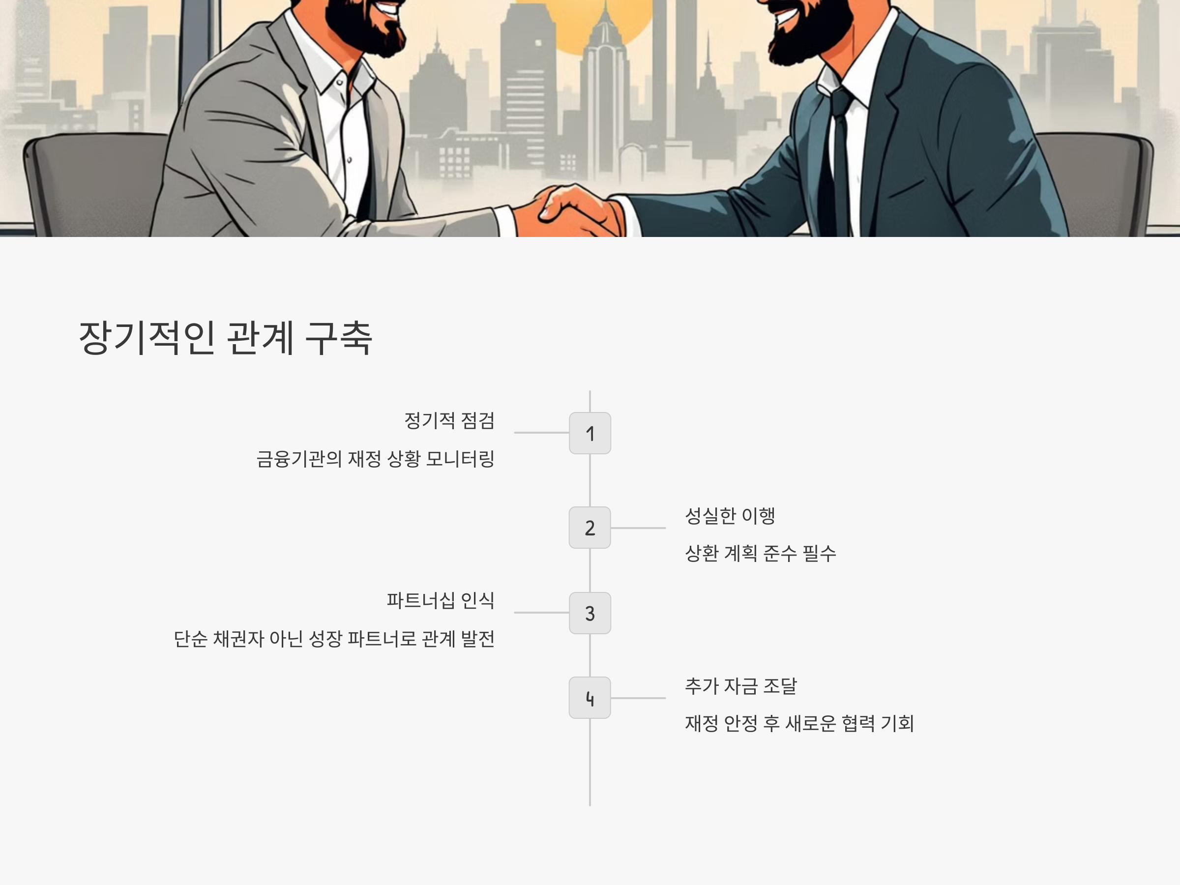 기업은 회복 계획을 성실히 이행하며, 재정 상태가 안정되면 향후 필요한 자금 조달을 위해 금융기관과의 관계를 더욱 강화할 수 있습니다. 이를 위해 지속적인 소통과 신뢰를 기반으로 한 장기적인 협력 관계를 구축하는 것이 중요합니다.