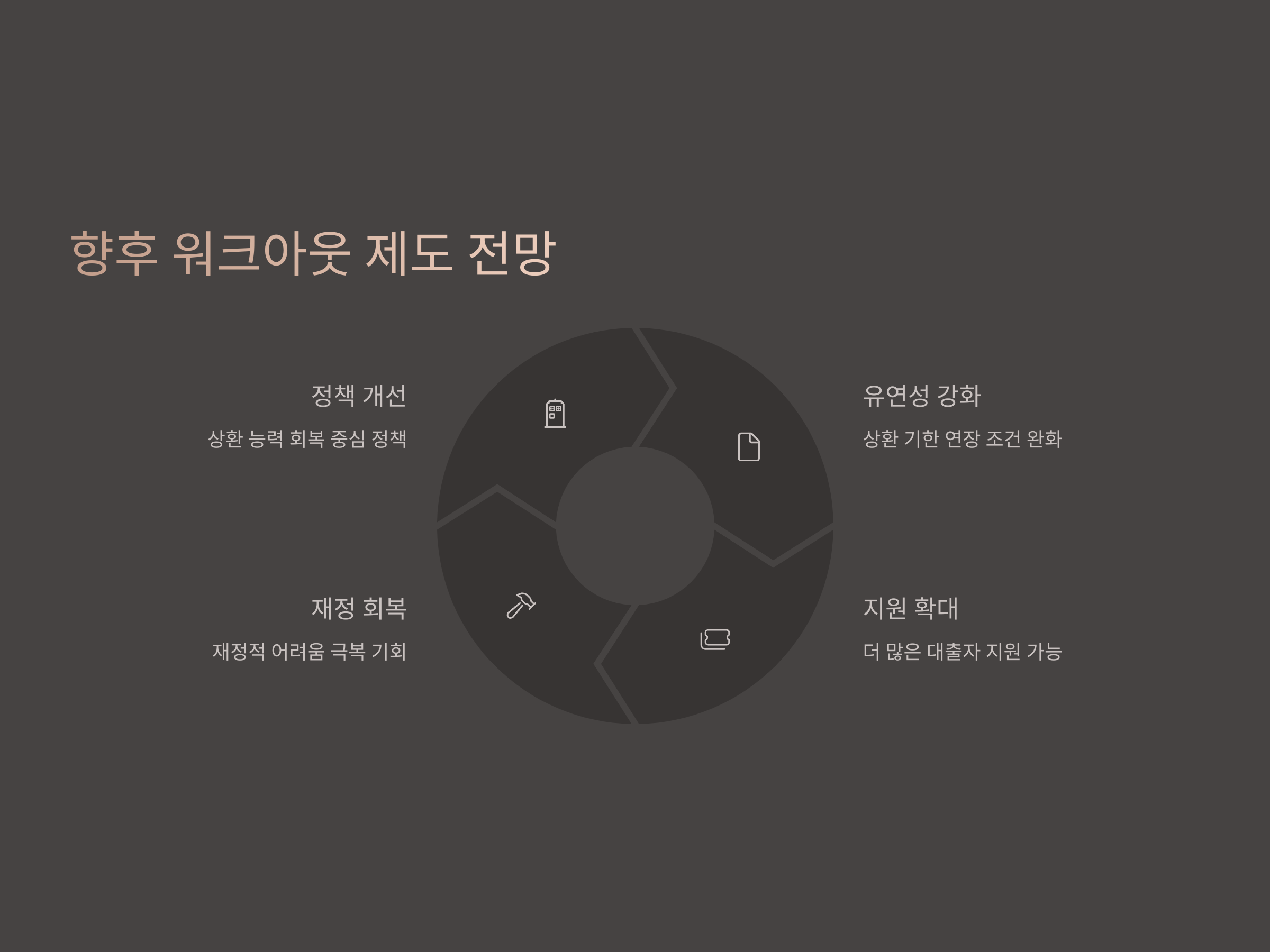 향후 워크아웃 제도의 정책은 대출자의 상환 능력 회복을 돕는 방향으로 지속적으로 개선될 것으로 예상됩니다. 대출 상환 기한 연장이 보다 유연하게 이루어질 수 있도록 정책적인 변화가 있을 가능성도 있으며, 이에 따라 더 많은 대출자가 워크아웃을 통해 재정적 어려움을 극복할 수 있을 것입니다.