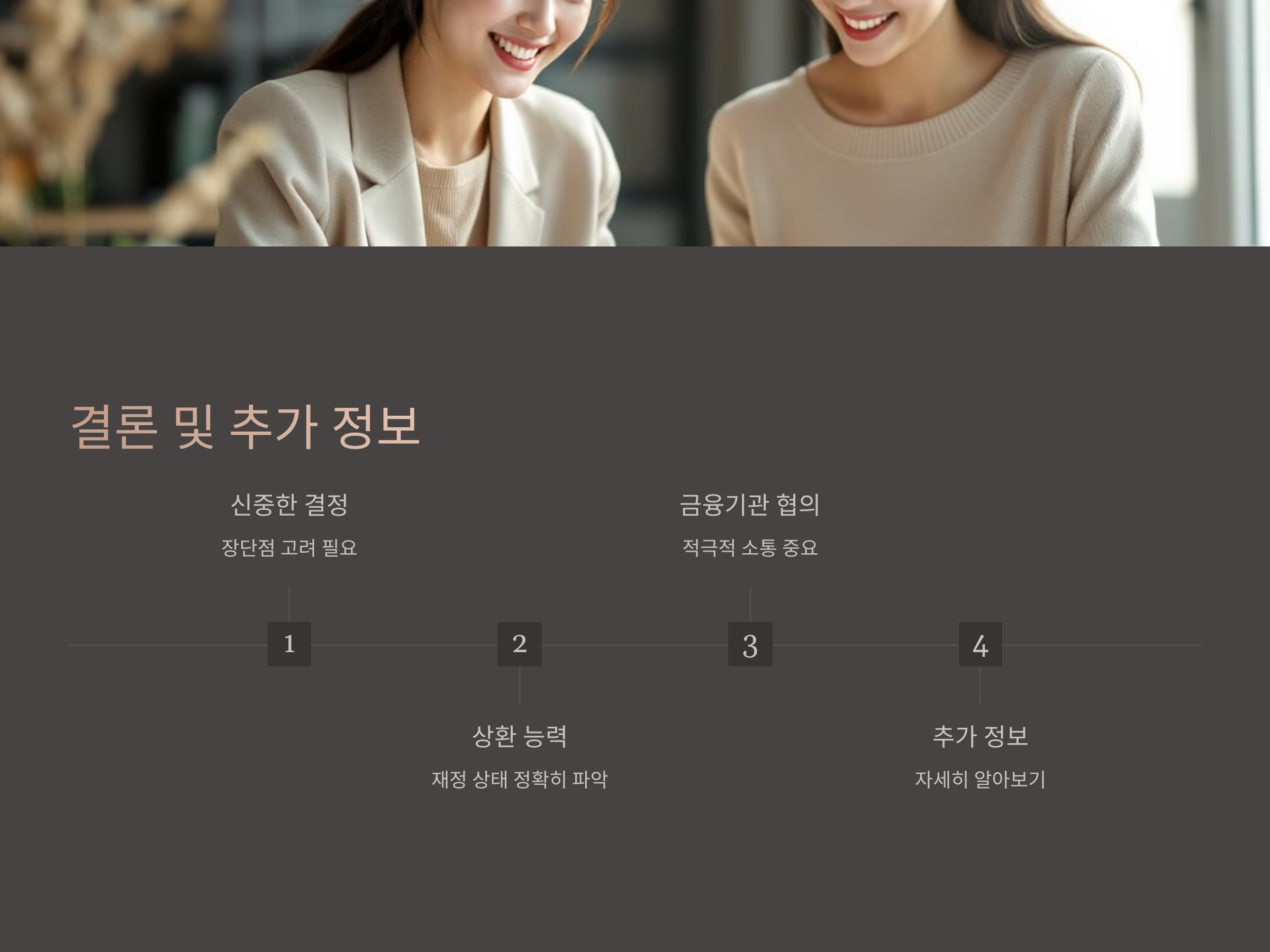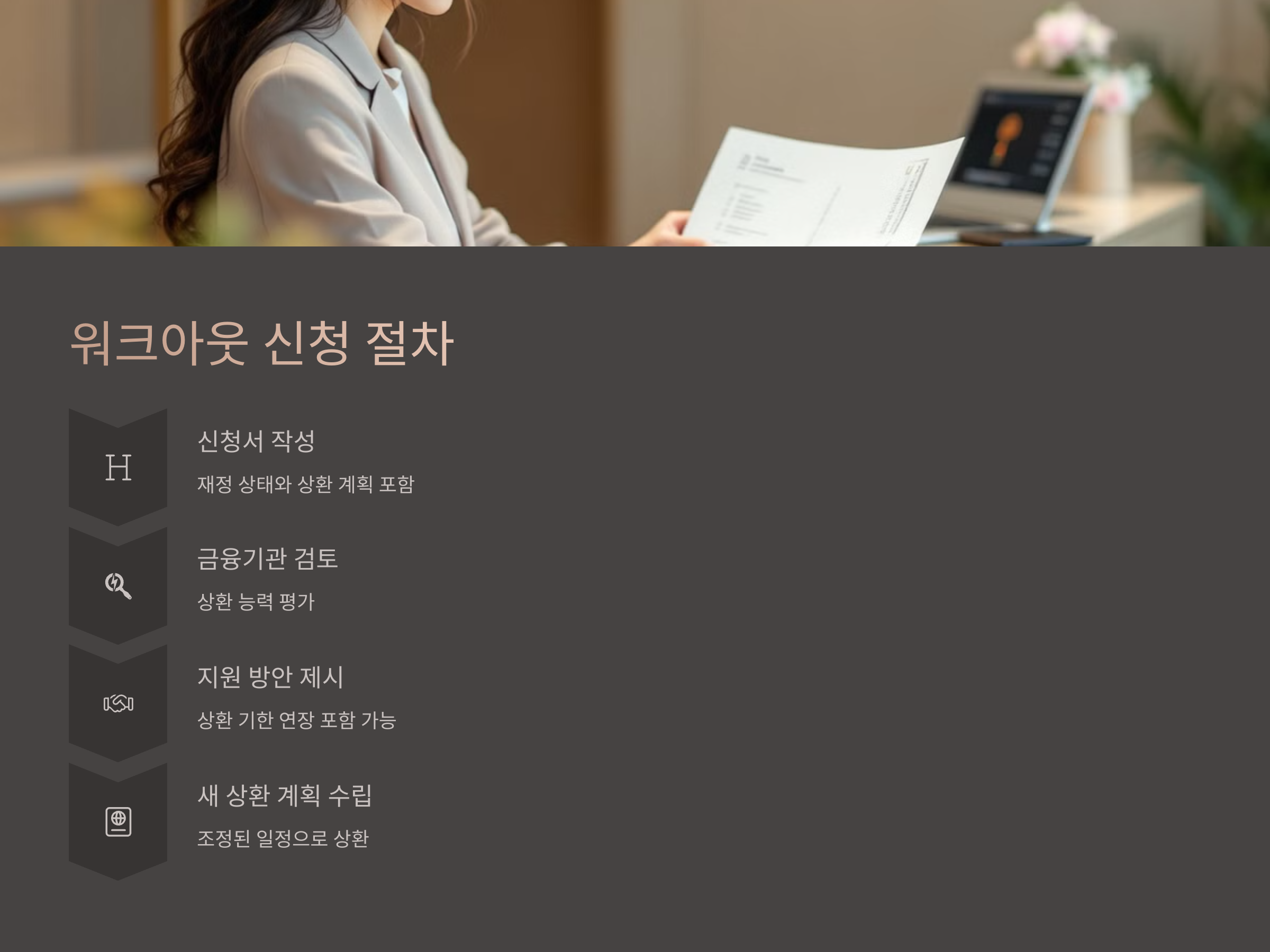 - 상환 능력 평가: 대출자가 워크아웃을 신청할 때, 금융기관은 신청자의 상환 능력을 평가합니다. 상환 능력이 부족할 경우, 상환 기한 연장이 어려울 수 있습니다.