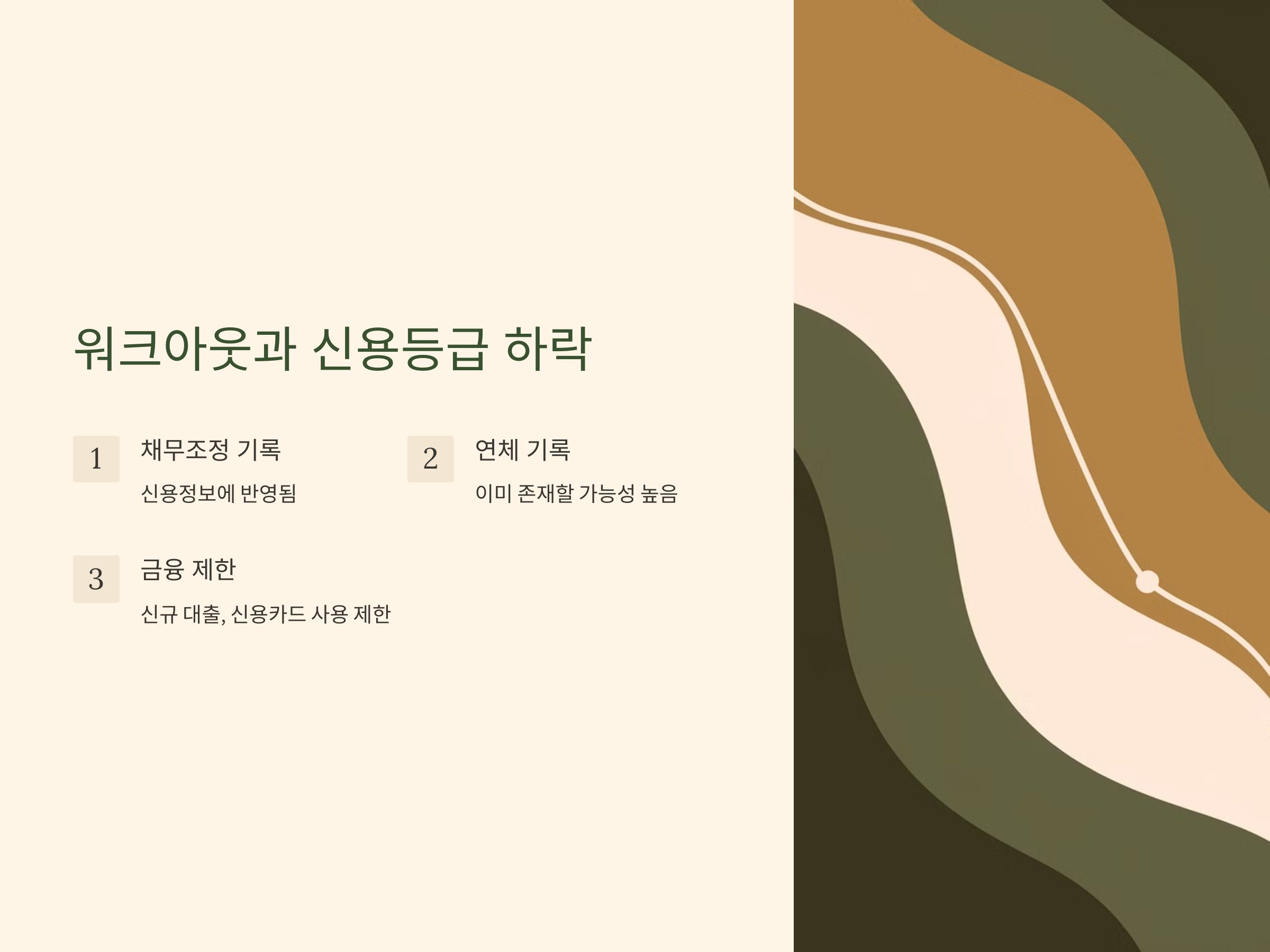 - 워크아웃: 금융채무가 있는 개인 중 일정 조건을 충족하면 신청 가능